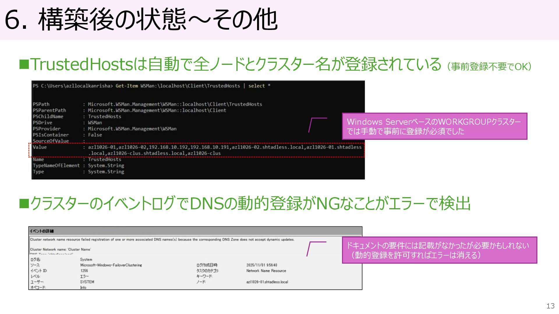 6. 構築後の状態~その他 13 ◼TrustedHostsは自動で全ノードとクラスター名が登録されている(事前登録不要でOK) ◼クラスターのイベントログでDNSの動的登録がNGなことがエラーで検出 ドキュメントの要件には記載がなかったが必要かもしれない (動的登録を許可すればエラーは消える) Windows ServerベースのWORKGROUPクラスター では手動で事前に登録が必須でした