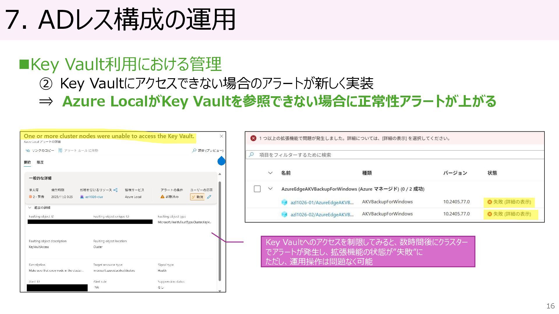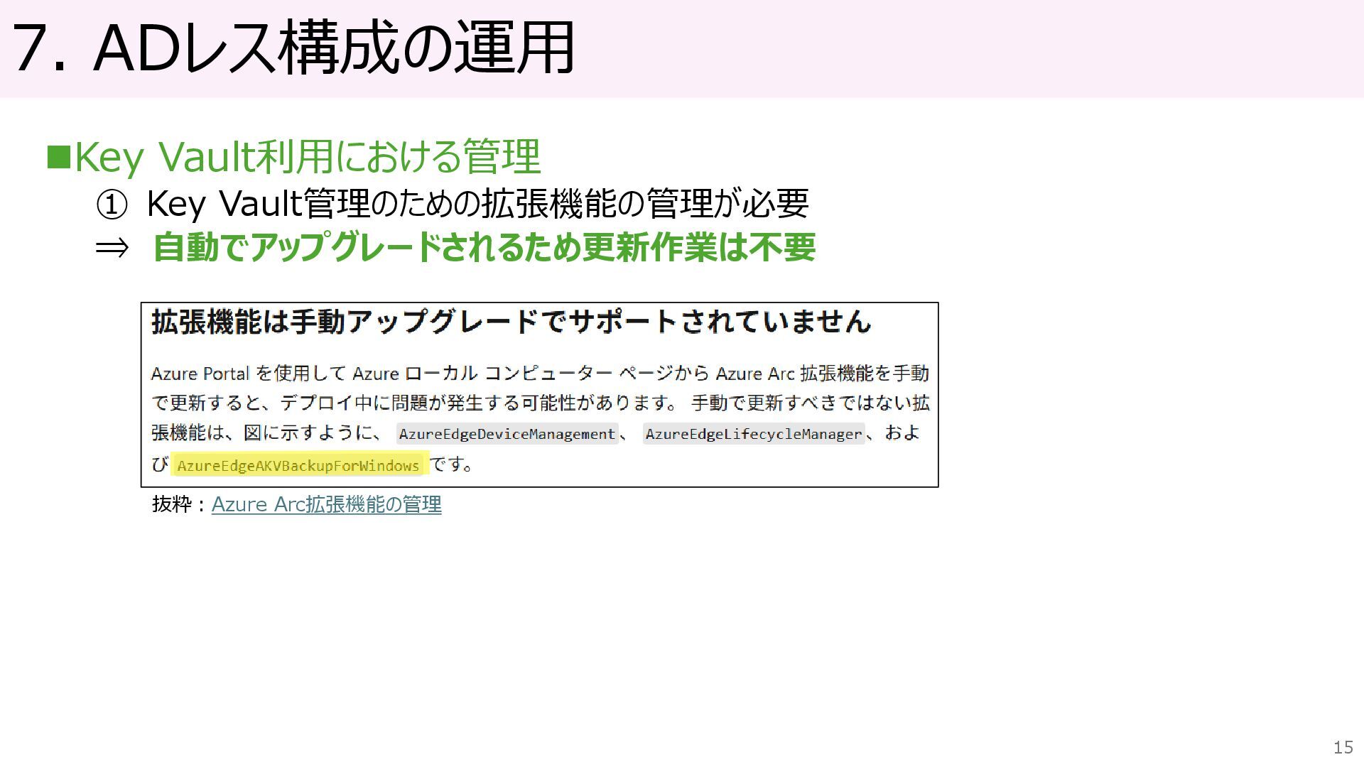 7. ADレス構成の運用 15 ◼Key Vault利用における管理 ① Key Vault管理のための拡張機能の管理が必要 ⇒ 自動でアップグレードされるため更新作業は不要