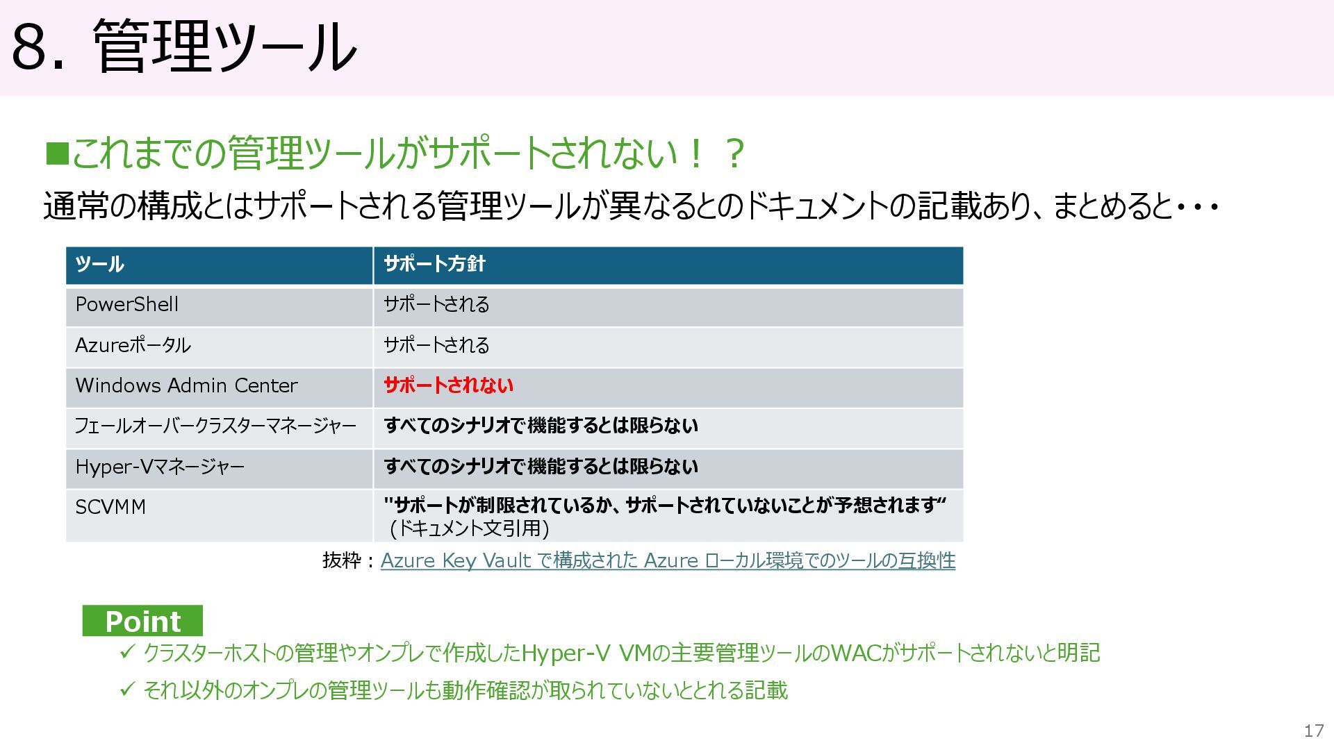 ローカル環境でのツールの互換性 ツール サポート方針 PowerShell サポートされる Azureポータル サポートされる Windows Admin Center サポートされない フェールオーバークラスターマネージャー すべてのシナリオで機能するとは限らない Hyper-Vマネージャー すべてのシナリオで機能するとは限らない SCVMM "サポートが制限されているか、サポートされていないことが予想されます“ (ドキュメント文引用) ✓ クラスターホストの管理やオンプレで作成したHyper-V VMの主要管理ツールのWACがサポートされないと明記 ✓ それ以外のオンプレの管理ツールも動作確認が取られていないととれる記載 Point