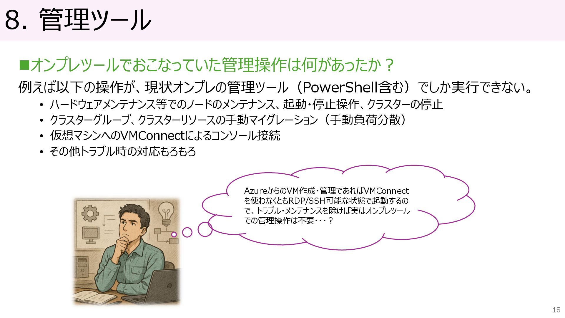 8. 管理ツール 18 ◼オンプレツールでおこなっていた管理操作は何があったか? 例えば以下の操作が、現状オンプレの管理ツール(PowerShell含む)でしか実行できない。 • ハードウェアメンテナンス等でのノードのメンテナンス、起動・停止操作、クラスターの停止 • クラスターグループ、クラスターリソースの手動マイグレーション(手動負荷分散) •