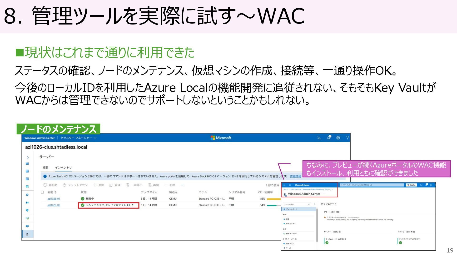 8. 管理ツールを実際に試す~WAC 19 ◼現状はこれまで通りに利用できた ステータスの確認、ノードのメンテナンス、仮想マシンの作成、接続等、一通り操作OK。 今後のローカルIDを利用したAzure Localの機能開発に追従されない、そもそもKey Vaultが WACからは管理できないのでサポートしないということかもしれない。 ノードのメンテナンス