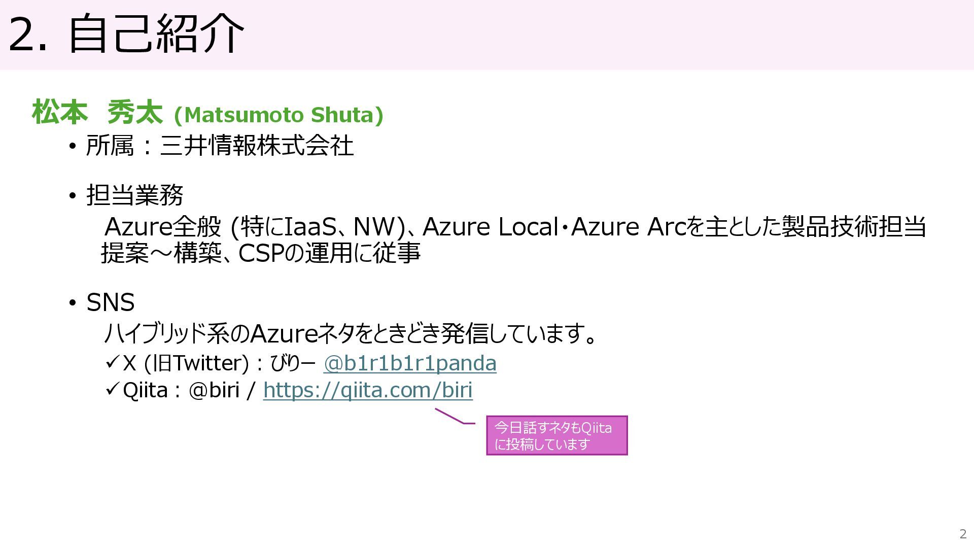 担当業務 Azure全般 (特にIaaS、NW)、Azure Local・Azure Arcを主とした製品技術担当 提案~構築、CSPの運用に従事 • SNS ハイブリッド系のAzureネタをときどき発信しています。 ✓X (旧Twitter):びりー @b1r1b1r1panda ✓Qiita:@biri / https://qiita.com/biri 今日話すネタもQiita に投稿しています