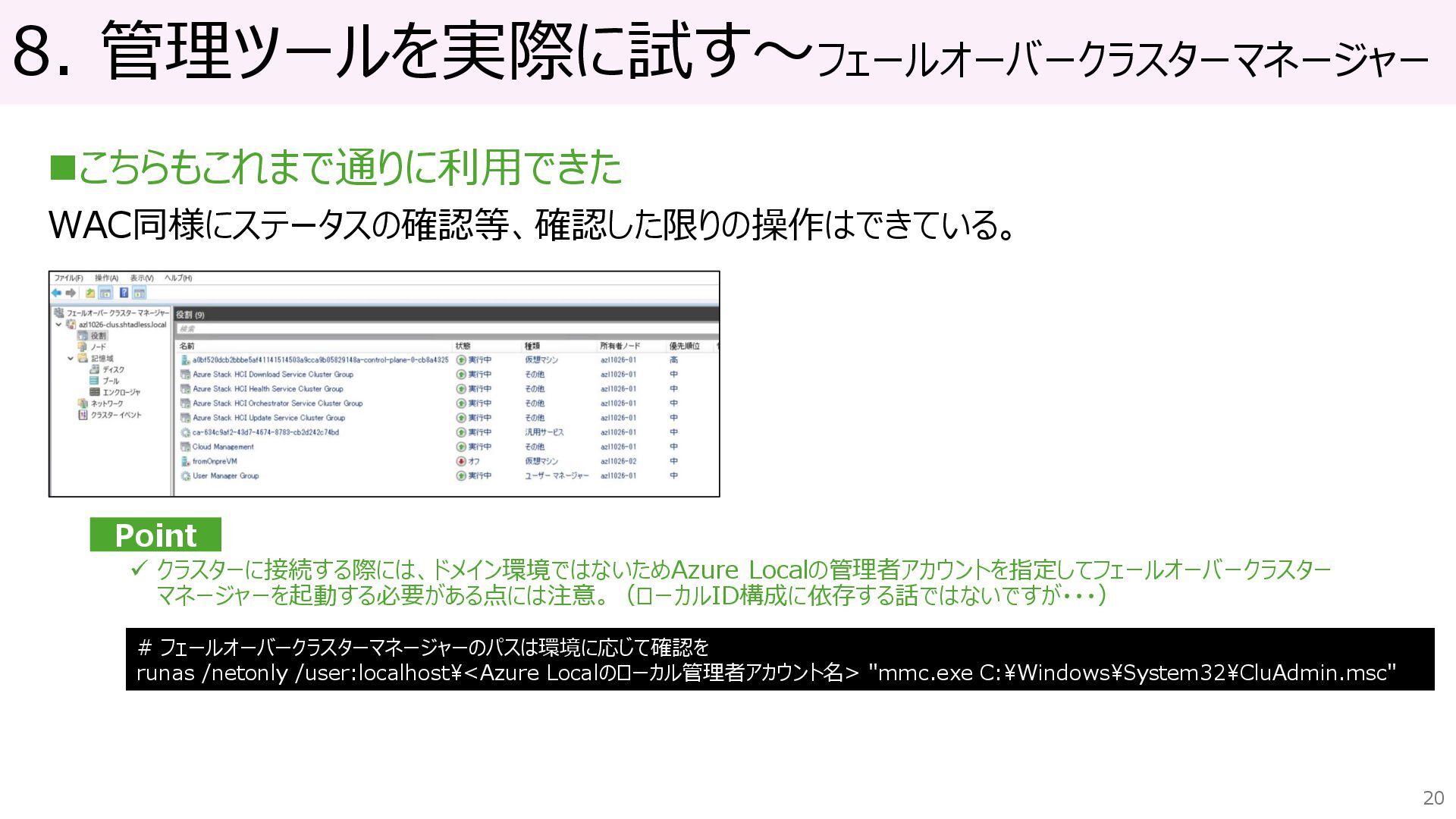 8. 管理ツールを実際に試す~フェールオーバークラスターマネージャー 20 ◼こちらもこれまで通りに利用できた WAC同様にステータスの確認等、確認した限りの操作はできている。 ✓ クラスターに接続する際には、ドメイン環境ではないためAzure Localの管理者アカウントを指定してフェールオーバークラスター マネージャーを起動する必要がある点には注意。(ローカルID構成に依存する話ではないですが・・・) Point