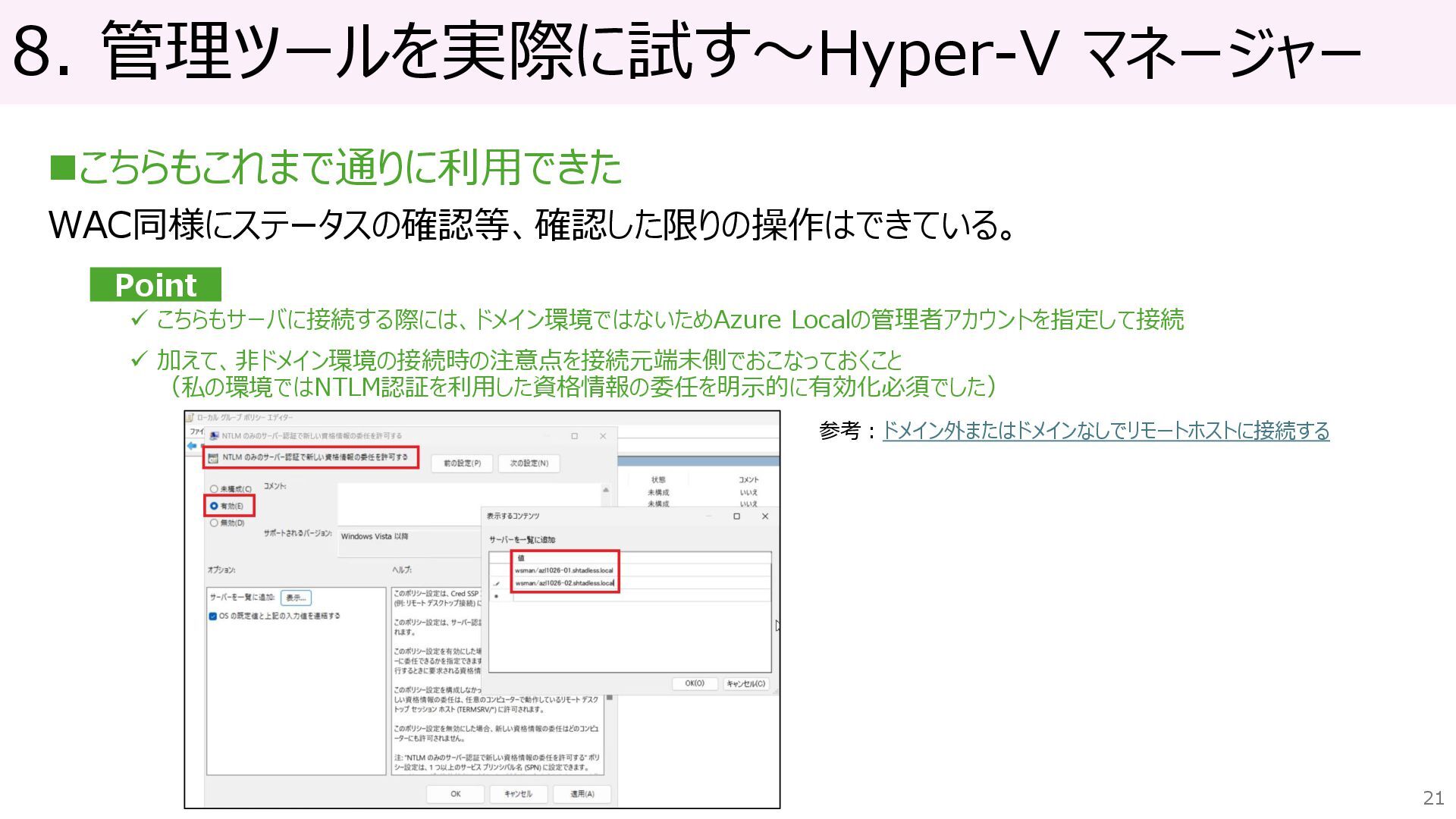 8. 管理ツールを実際に試す~Hyper-V マネージャー 21 ◼こちらもこれまで通りに利用できた WAC同様にステータスの確認等、確認した限りの操作はできている。 ✓ こちらもサーバに接続する際には、ドメイン環境ではないためAzure Localの管理者アカウントを指定して接続 ✓