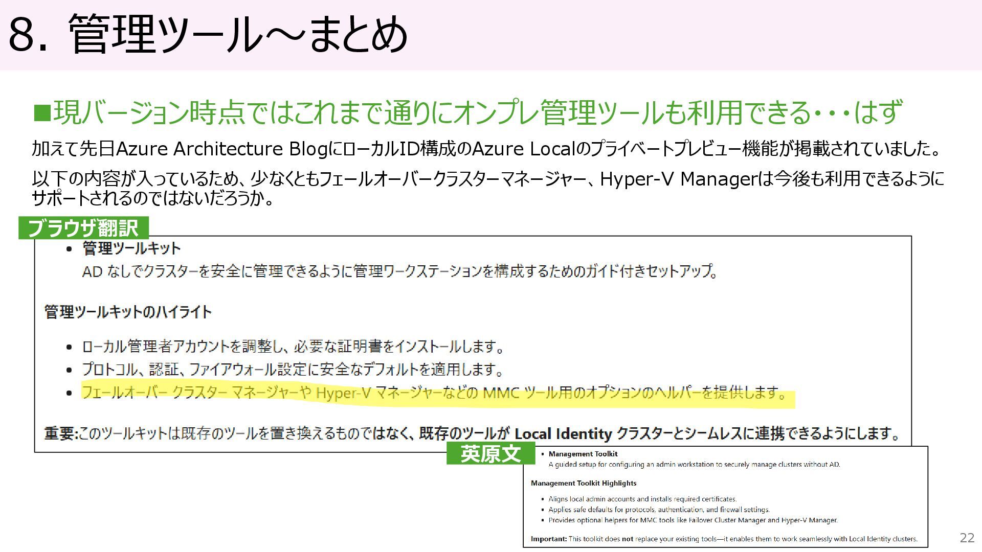 8. 管理ツール~まとめ 22 ◼現バージョン時点ではこれまで通りにオンプレ管理ツールも利用できる・・・はず 加えて先日Azure Architecture BlogにローカルID構成のAzure Localのプライベートプレビュー機能が掲載されていました。 以下の内容が入っているため、少なくともフェールオーバークラスターマネージャー、Hyper-V Managerは今後も利用できるように