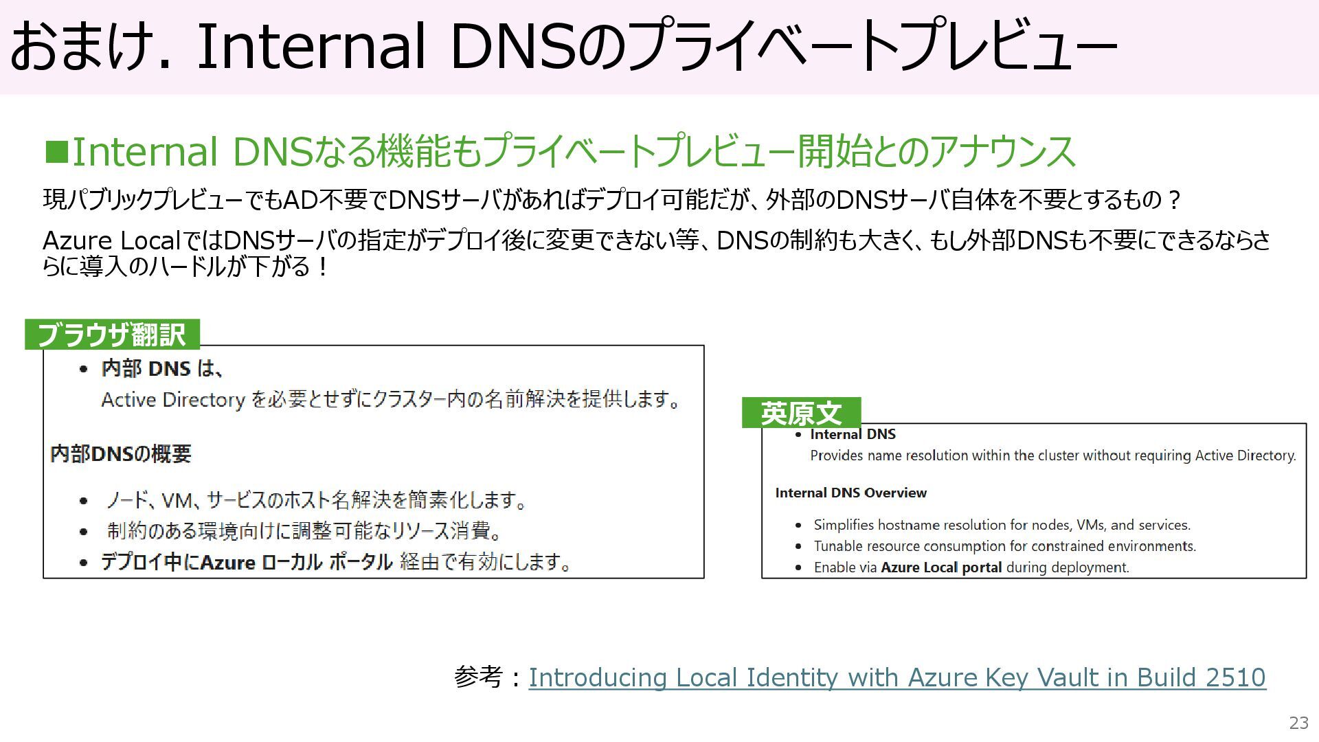 おまけ. Internal DNSのプライベートプレビュー 23 ◼Internal DNSなる機能もプライベートプレビュー開始とのアナウンス 現パブリックプレビューでもAD不要でDNSサーバがあればデプロイ可能だが、外部のDNSサーバ自体を不要とするもの? Azure LocalではDNSサーバの指定がデプロイ後に変更できない等、DNSの制約も大きく、もし外部DNSも不要にできるならさ らに導入のハードルが下がる!