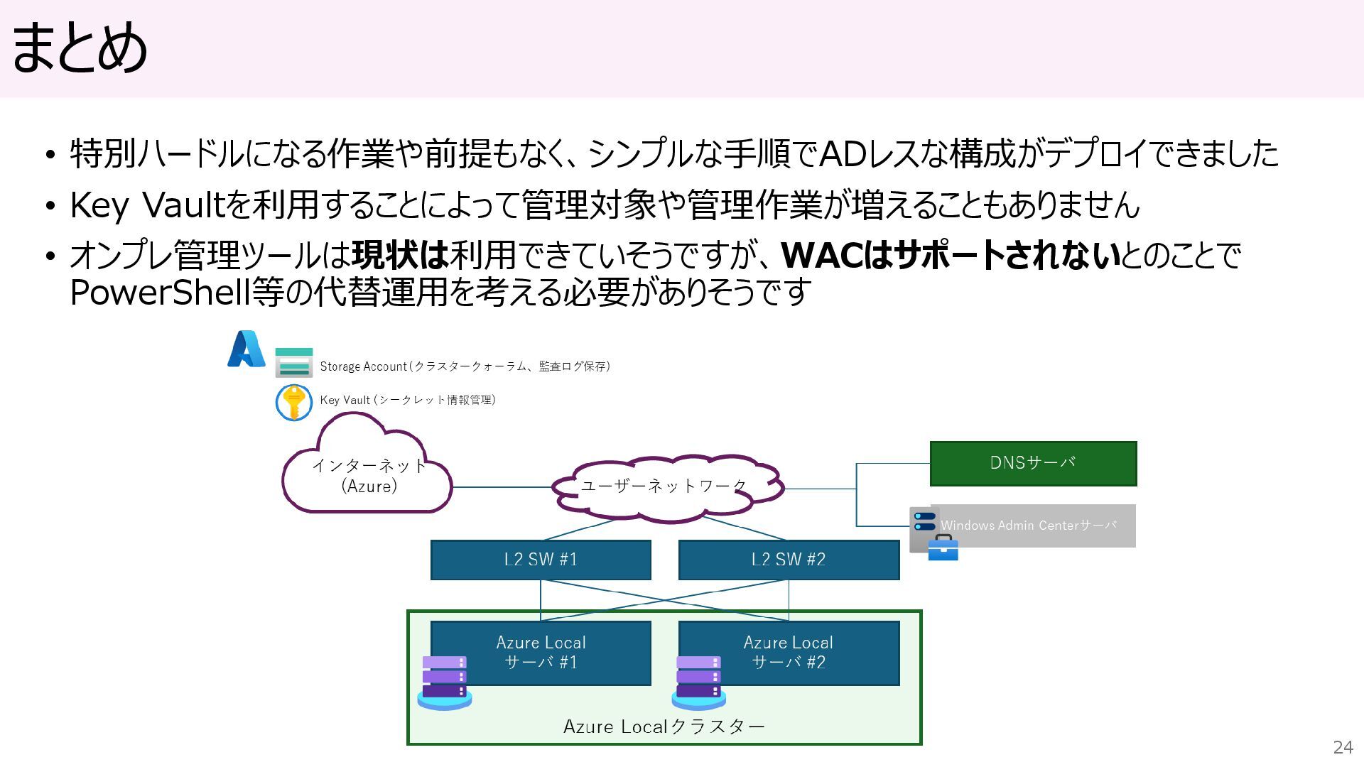 まとめ 24 • 特別ハードルになる作業や前提もなく、シンプルな手順でADレスな構成がデプロイできました • Key Vaultを利用することによって管理対象や管理作業が増えることもありません • オンプレ管理ツールは現状は利用できていそうですが、WACはサポートされないとのことで PowerShell等の代替運用を考える必要がありそうです