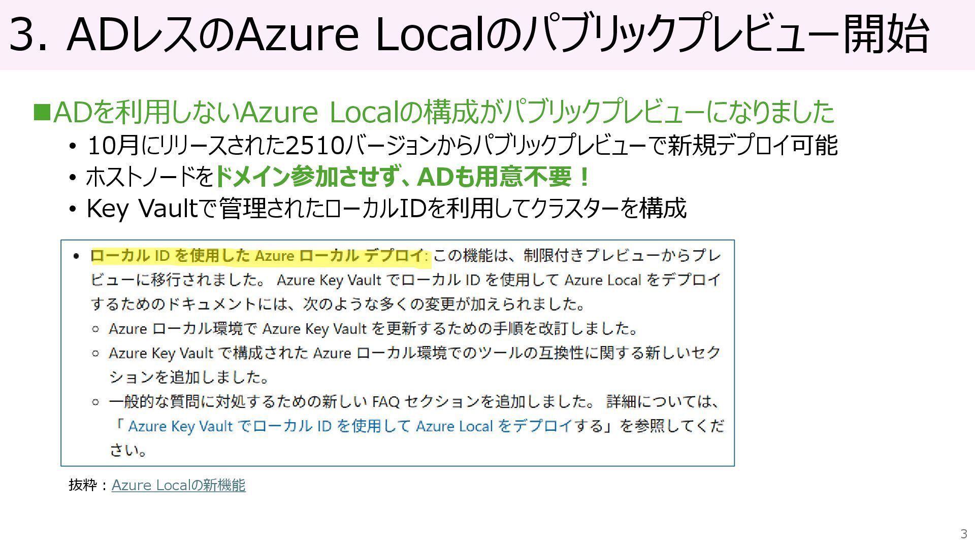 3. ADレスのAzure Localのパブリックプレビュー開始 3 ◼ADを利用しないAzure Localの構成がパブリックプレビューになりました • 10月にリリースされた2510バージョンからパブリックプレビューで新規デプロイ可能 • ホストノードをドメイン参加させず、ADも用意不要!