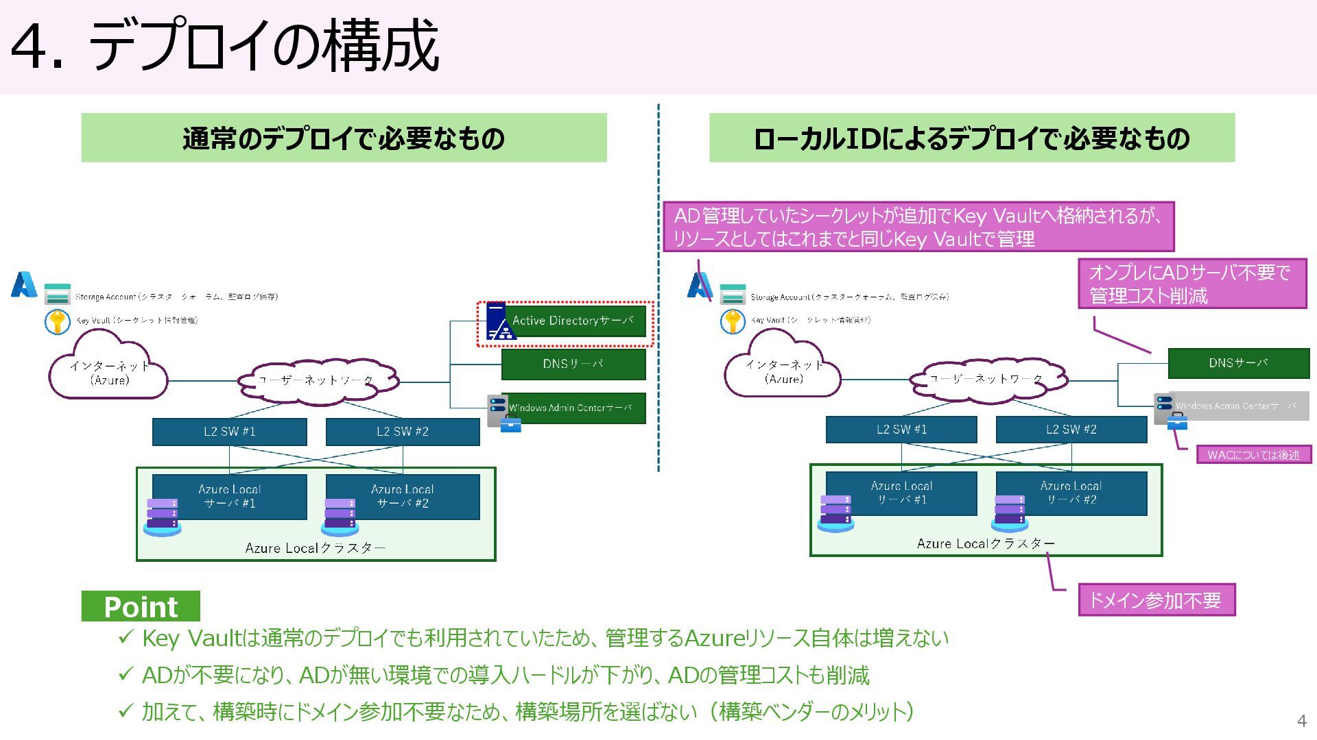 4. デプロイの構成 4 ✓ Key Vaultは通常のデプロイでも利用されていたため、管理するAzureリソース自体は増えない ✓ ADが不要になり、ADが無い環境での導入ハードルが下がり、ADの管理コストも削減 ✓ 加えて、構築時にドメイン参加不要なため、構築場所を選ばない(構築ベンダーのメリット)