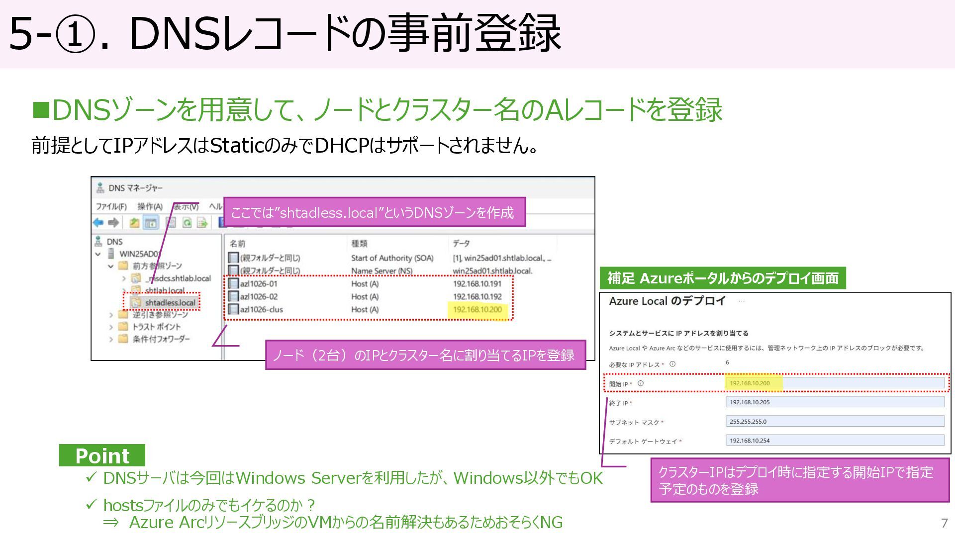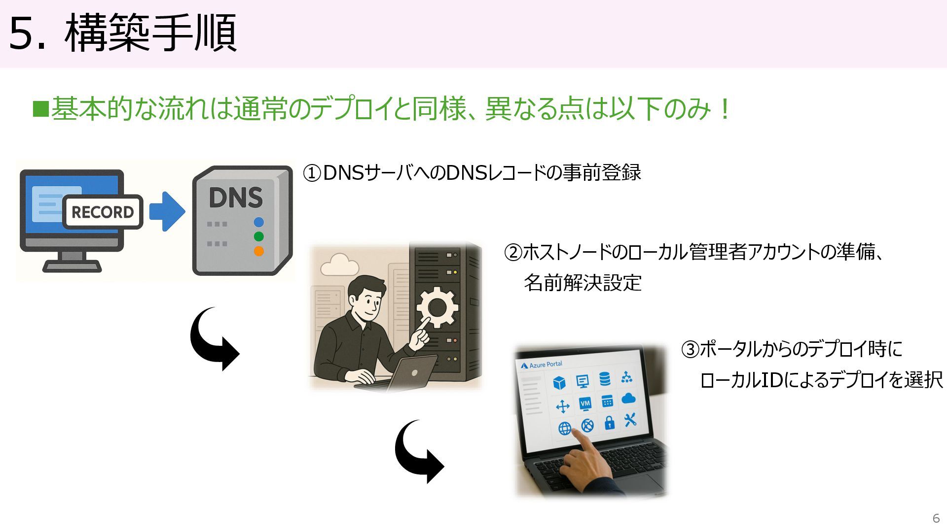 5. 構築手順 6 ◼基本的な流れは通常のデプロイと同様、異なる点は以下のみ! ①DNSサーバへのDNSレコードの事前登録 ③ポータルからのデプロイ時に ローカルIDによるデプロイを選択 ②ホストノードのローカル管理者アカウントの準備、 名前解決設定