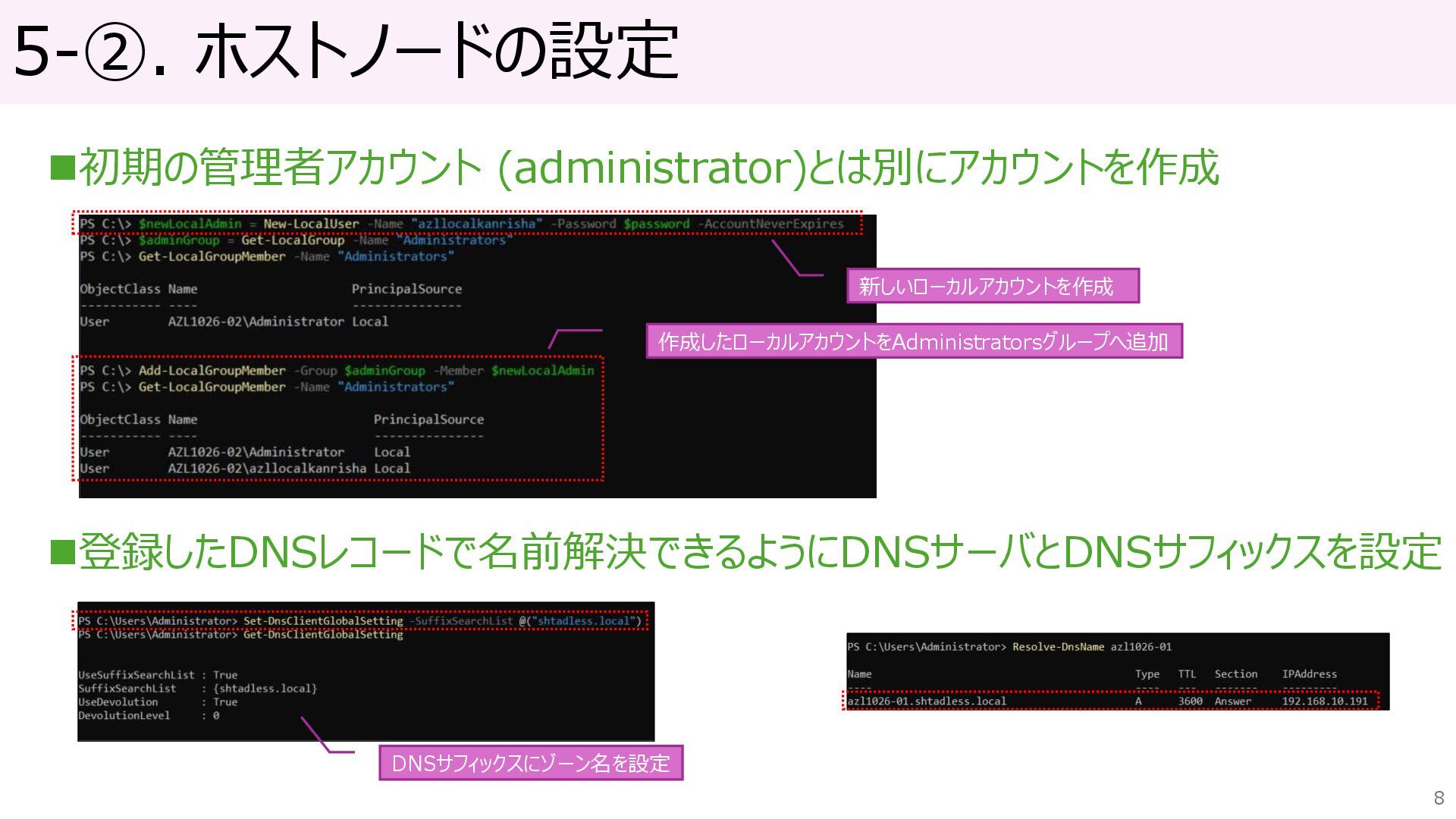 5-①. DNSレコードの事前登録 7 ◼DNSゾーンを用意して、ノードとクラスター名のAレコードを登録 前提としてIPアドレスはStaticのみでDHCPはサポートされません。 ここでは”shtadless.local”というDNSゾーンを作成 ノード(2台)のIPとクラスター名に割り当てるIPを登録 クラスターIPはデプロイ時に指定する開始IPで指定 予定のものを登録 補足