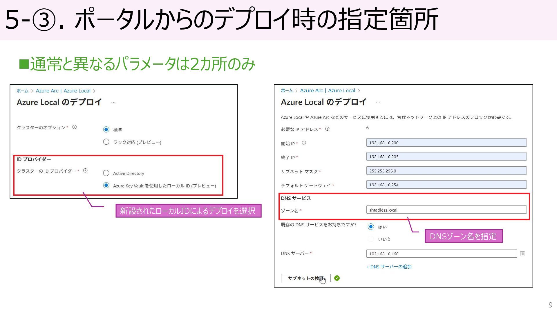 5-③. ポータルからのデプロイ時の指定箇所 9 ◼通常と異なるパラメータは2カ所のみ 新設されたローカルIDによるデプロイを選択 DNSゾーン名を指定