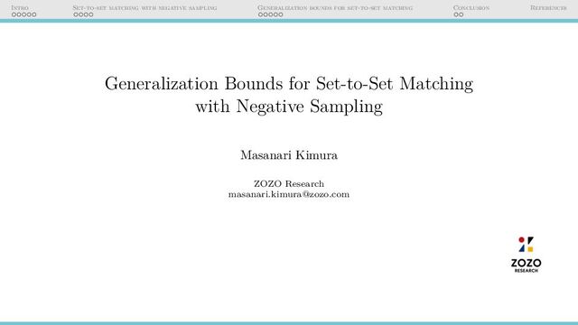 Intro . . . . . . . . Set-to-set matching with negative sampling . . . . . . . . . . Generalization bounds for set-to-set matching . . . . Conclusion References Problem setup Let xn, ym ∈ X = Rd be d-dimensional feature vectors representing the features of each individual item. Let X = {x1, . . . , xN} and Y = {y1, . . . , yM} be sets of these feature vectors, where X, Y ∈ 2X and N, M ∈ N are sizes of the sets. The function f : 2X × 2X → R calculates a matching score between the two sets X and Y. We consider tasks where the matching function f is used per pair of sets Zhu et al. [2013] to select a correct matching. Given candidate pairs of sets (X, Y(k)), where X, Y(k) ∈ 2X and k ∈ {1, . . . , K}, we choose Y(k∗) as a correct one so that f(X, Y(k∗)) achieves the maximum score from amongst the K candidates. 4/18