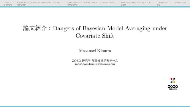 Intro . . . . . . . . . . BNNs are not robust to covariate shift . . . . . . . . . . . . Understanding BNNs under covariate shift . . . . . . Towards more robust BMA . . . . Discussion References References I Vincent Fortuin. Priors in bayesian deep learning: A review. International Statistical Review, 2022. Pavel Izmailov, Patrick Nicholson, Sanae Lotfi, and Andrew G Wilson. Dangers of bayesian model averaging under covariate shift. Advances in Neural Information Processing Systems, 34:3309–3322, 2021a. Pavel Izmailov, Sharad Vikram, Matthew D Hoffman, and Andrew Gordon Gordon Wilson. What are bayesian neural network posteriors really like? In International conference on machine learning, pages 4629–4640. PMLR, 2021b. Alex Krizhevsky, Vinod Nair, and Geoffrey Hinton. Cifar-10 (canadian institute for advanced research). 2014. URL http://www.cs.toronto.edu/~kriz/cifar.html. Yann LeCun and Corinna Cortes. MNIST handwritten digit database. 2010. URL http://yann.lecun.com/exdb/mnist/. Herbert Robbins and Sutton Monro. A stochastic approximation method. The annals of mathematical statistics, pages 400–407, 1951. 23/23