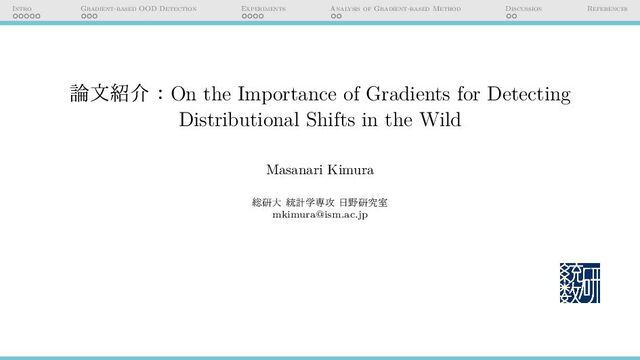 Intro . . . . . . Gradient-based OOD Detection . . . . . . . . Experiments . . . . Analysis of Gradient-based Method . . . . Discussion References References II Grant Van Horn, Oisin Mac Aodha, Yang Song, Yin Cui, Chen Sun, Alex Shepard, Hartwig Adam, Pietro Perona, and Serge Belongie. The inaturalist species classification and detection dataset. In Proceedings of the IEEE conference on computer vision and pattern recognition, pages 8769–8778, 2018. Jianxiong Xiao, James Hays, Krista A Ehinger, Aude Oliva, and Antonio Torralba. Sun database: Large-scale scene recognition from abbey to zoo. In 2010 IEEE computer society conference on computer vision and pattern recognition, pages 3485–3492. IEEE, 2010. Bolei Zhou, Agata Lapedriza, Aditya Khosla, Aude Oliva, and Antonio Torralba. Places: A 10 million image database for scene recognition. IEEE transactions on pattern analysis and machine intelligence, 40(6):1452–1464, 2017. 19/19