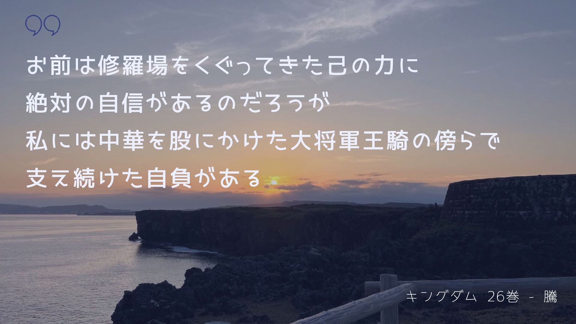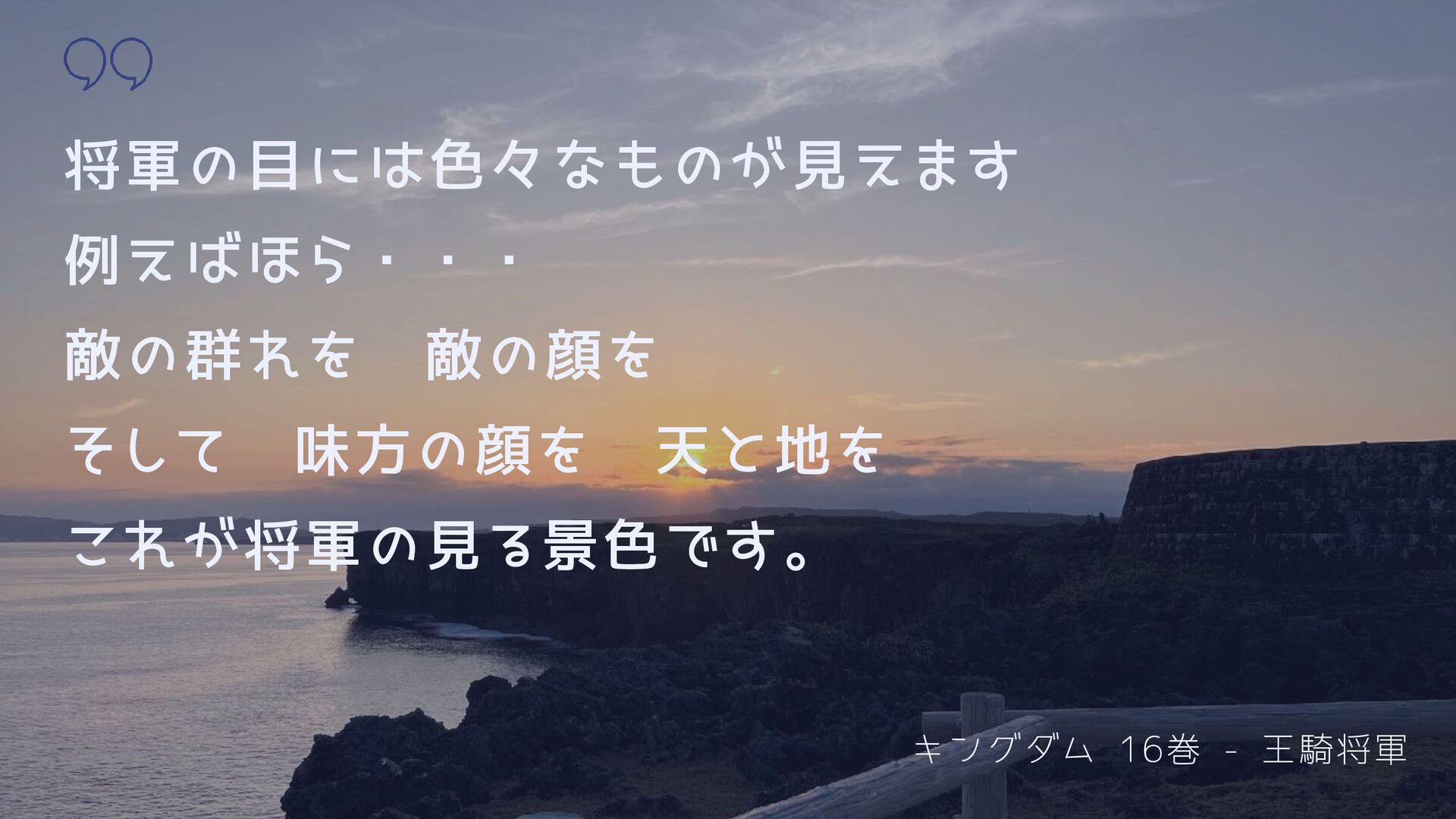 キングダム 16巻 - 王騎将軍 将軍の目には色々なものが見えます 例えばほら・・・ 敵の群れを 敵の顔を そして 味方の顔を 天と地を これが将軍の見る景色です。