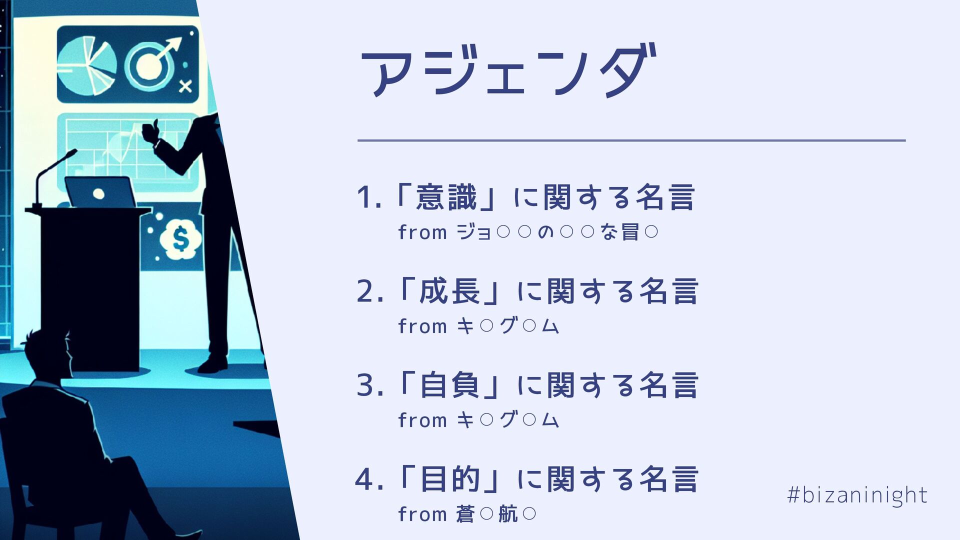 ⚪︎ 2.「成長」に関する名言 from キ ⚪︎ グ ⚪︎ ム 3.「自負」に関する名言 from キ ⚪︎ グ ⚪︎ ム 4.「目的」に関する名言 from 蒼 ⚪︎ 航 ⚪︎ #bizaninight