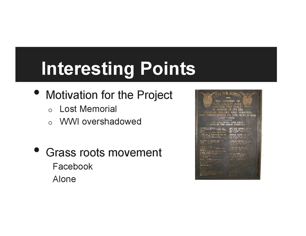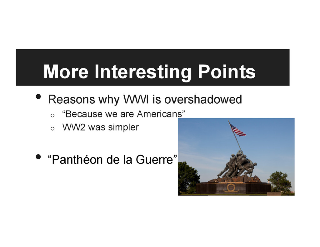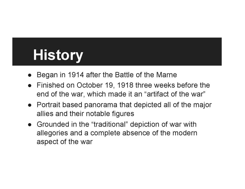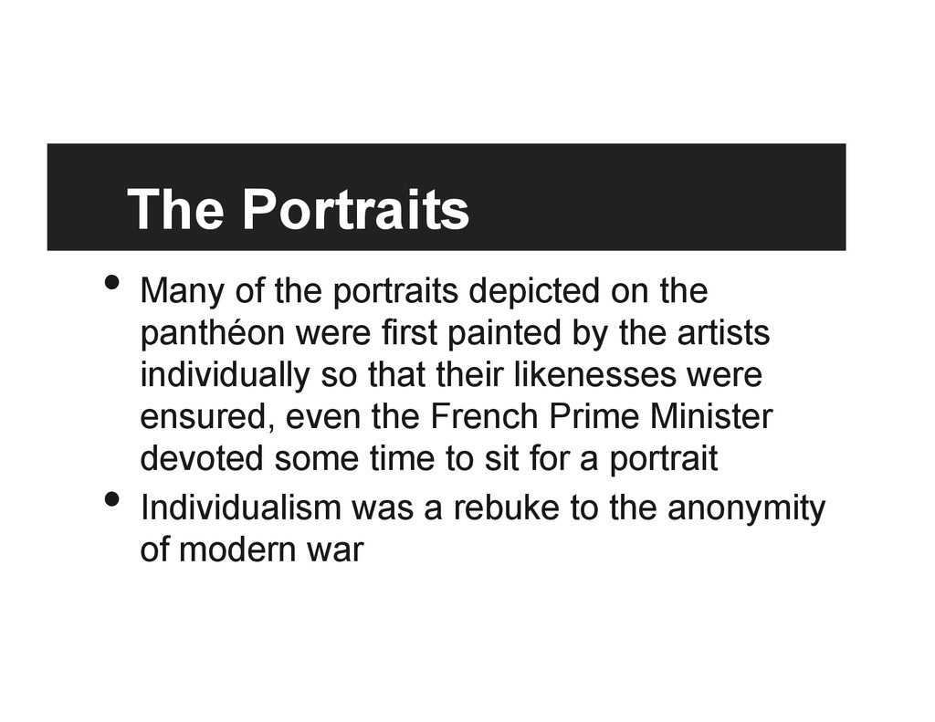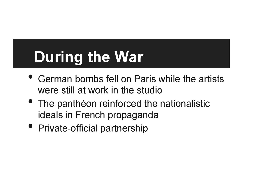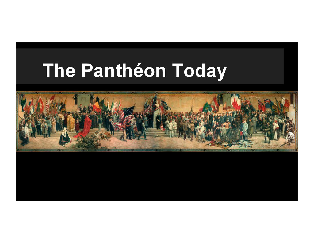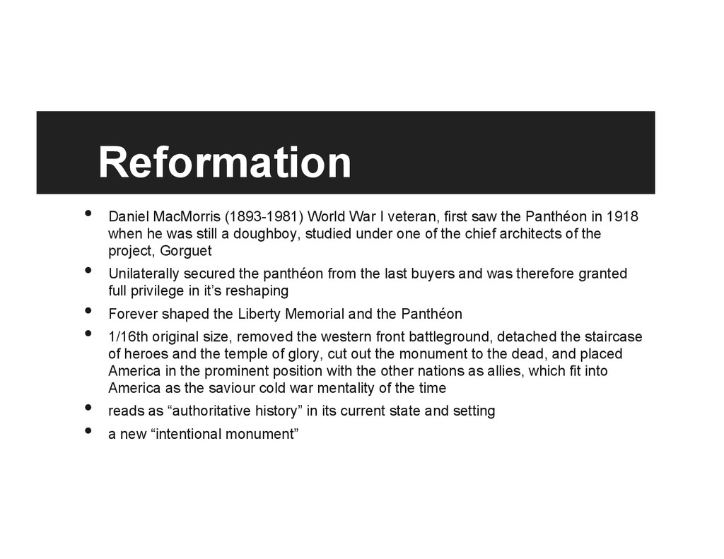 saw the Panthéon in 1918 when he was still a doughboy, studied under one of the chief architects of the project, Gorguet • Unilaterally secured the panthéon from the last buyers and was therefore granted full privilege in it’s reshaping • Forever shaped the Liberty Memorial and the Panthéon • 1/16th original size, removed the western front battleground, detached the staircase of heroes and the temple of glory, cut out the monument to the dead, and placed America in the prominent position with the other nations as allies, which fit into America as the saviour cold war mentality of the time • reads as “authoritative history” in its current state and setting • a new “intentional monument”