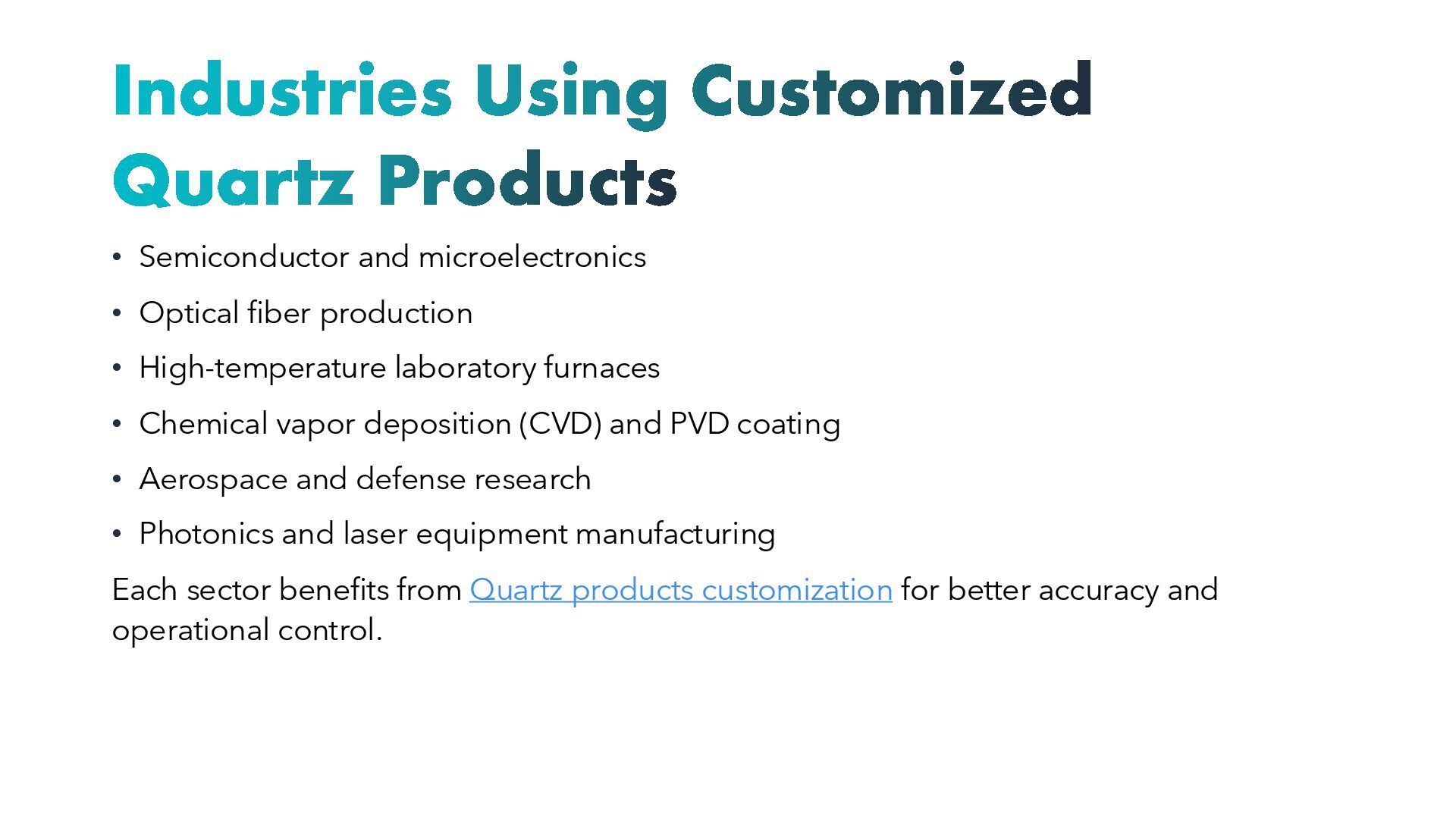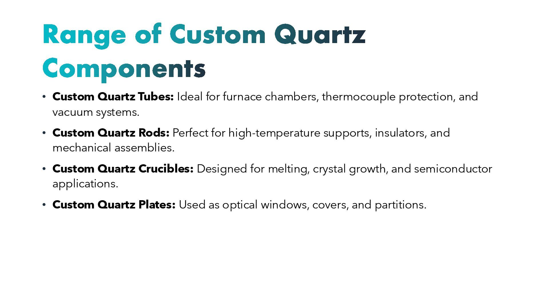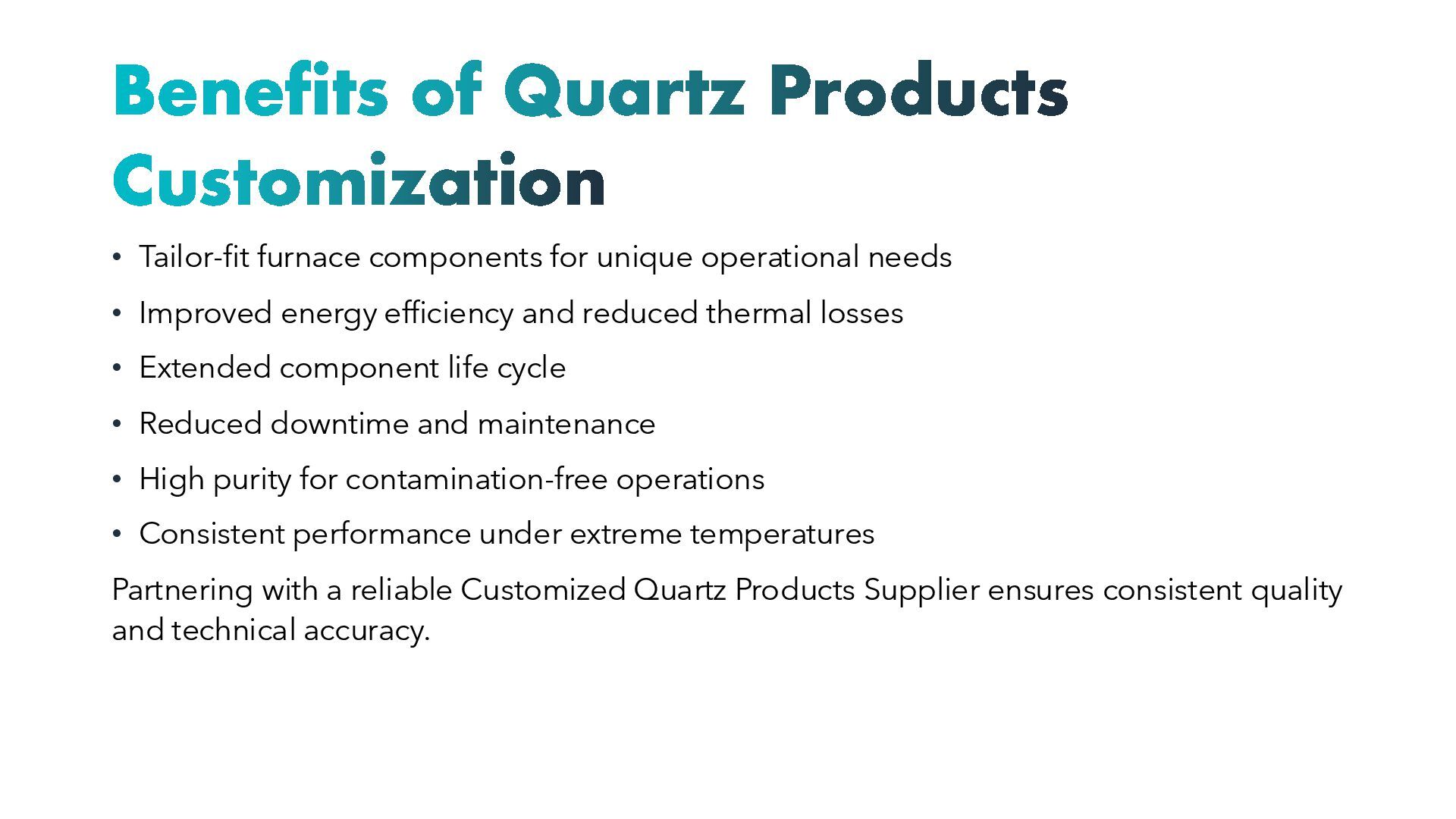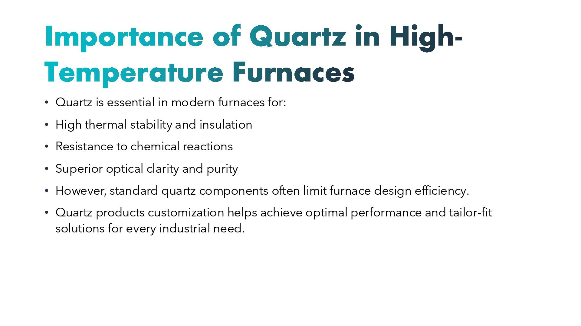 This presentation examines how customized quartz components overcome design limitations in high-temperature furnaces. It highlights precision-engineered quartz tubes, liners, and crucibles that improve thermal uniformity, chemical resistance, and optical clarity, enabling advanced performance in semiconductor, glass, and metallurgical applications.