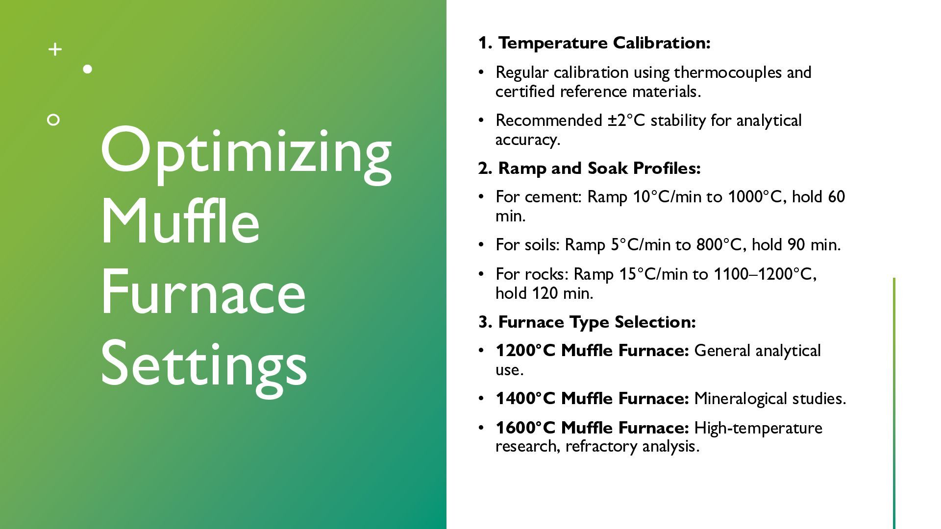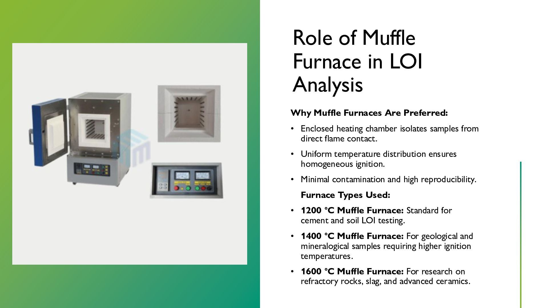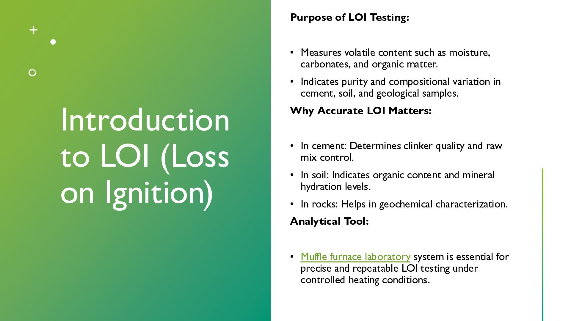 Achieve precise LOI (Loss on Ignition) results by optimizing muffle furnace parameters for cement, soil, and rock analysis. This presentation covers ideal heating rates, temperature stability, crucible handling, and error-reduction practices to ensure consistent and accurate LOI measurements.
