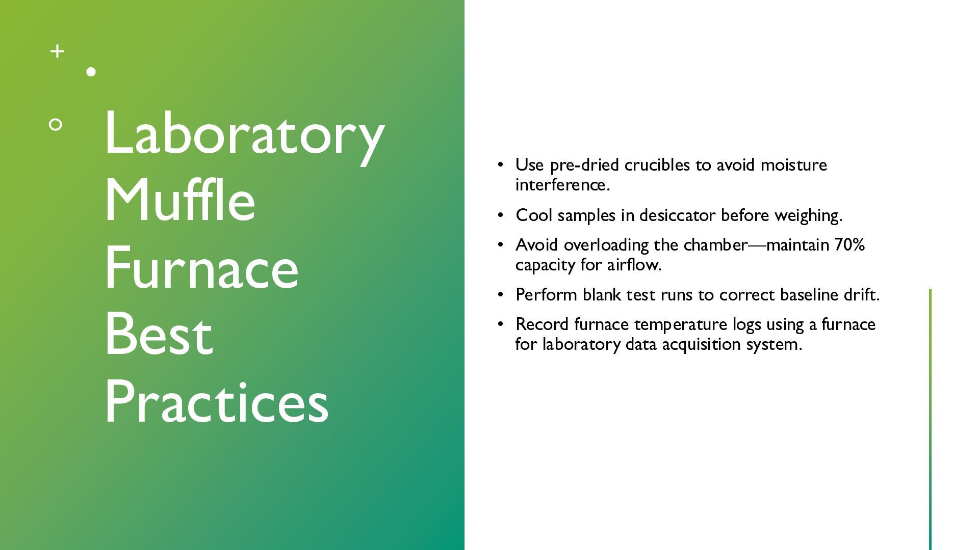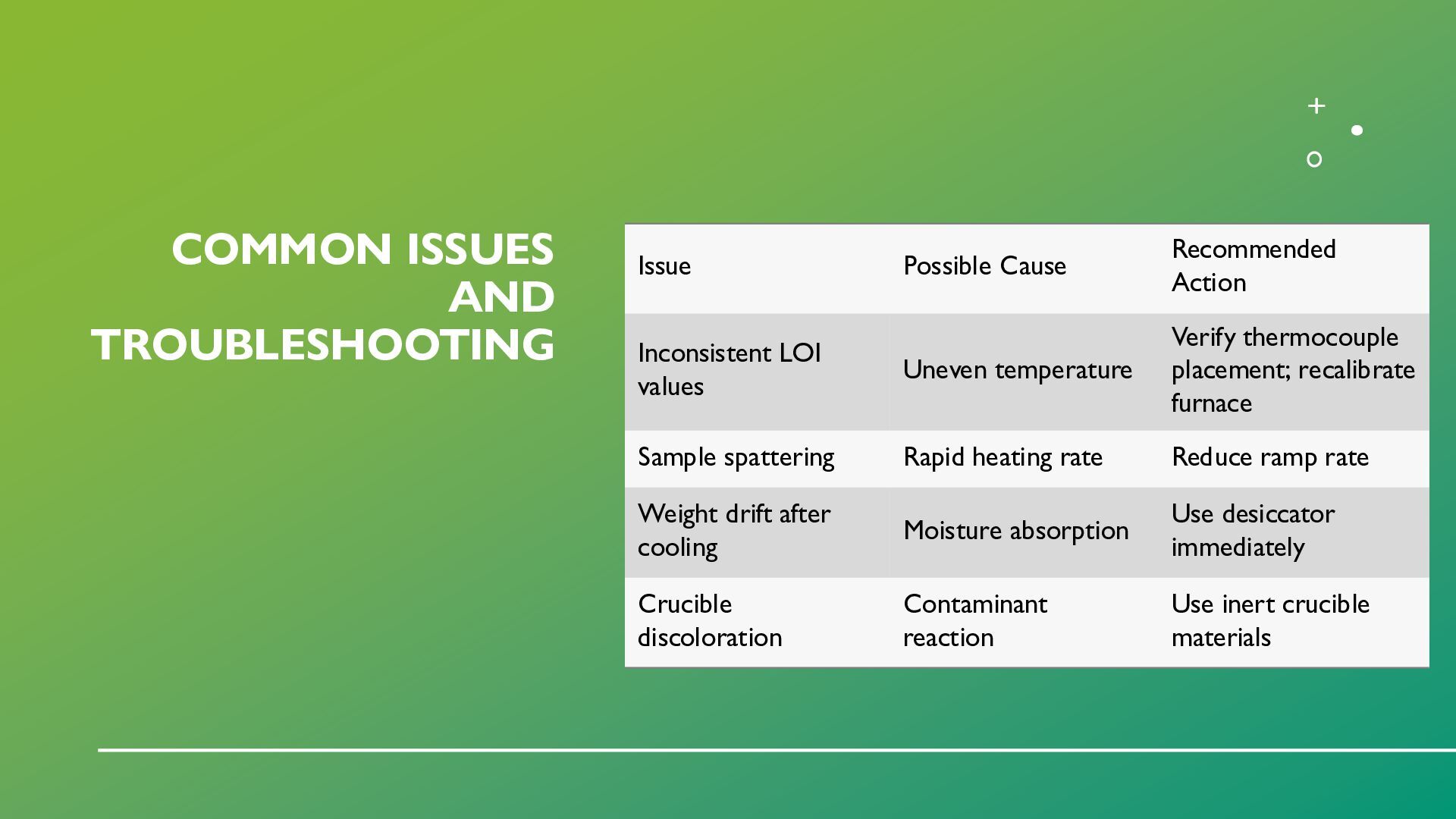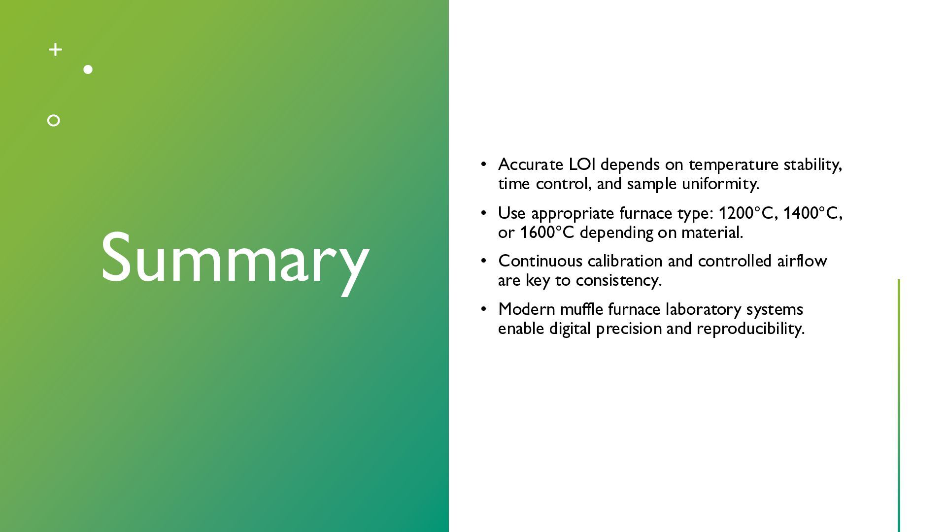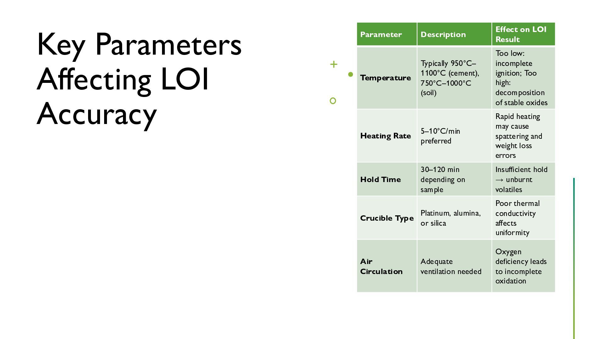 Achieve precise LOI (Loss on Ignition) results by optimizing muffle furnace parameters for cement, soil, and rock analysis. This presentation covers ideal heating rates, temperature stability, crucible handling, and error-reduction practices to ensure consistent and accurate LOI measurements.