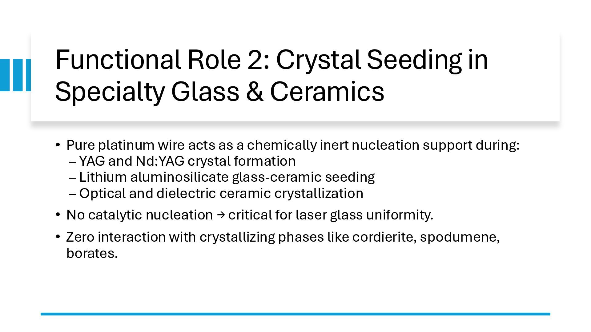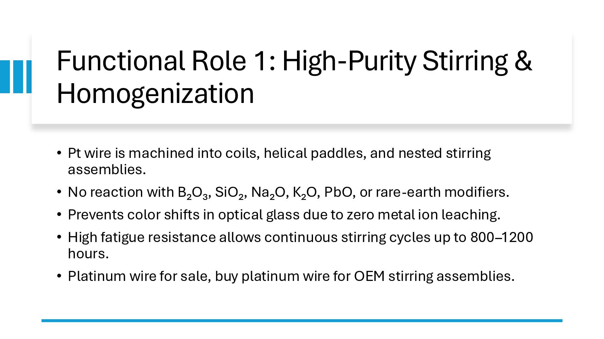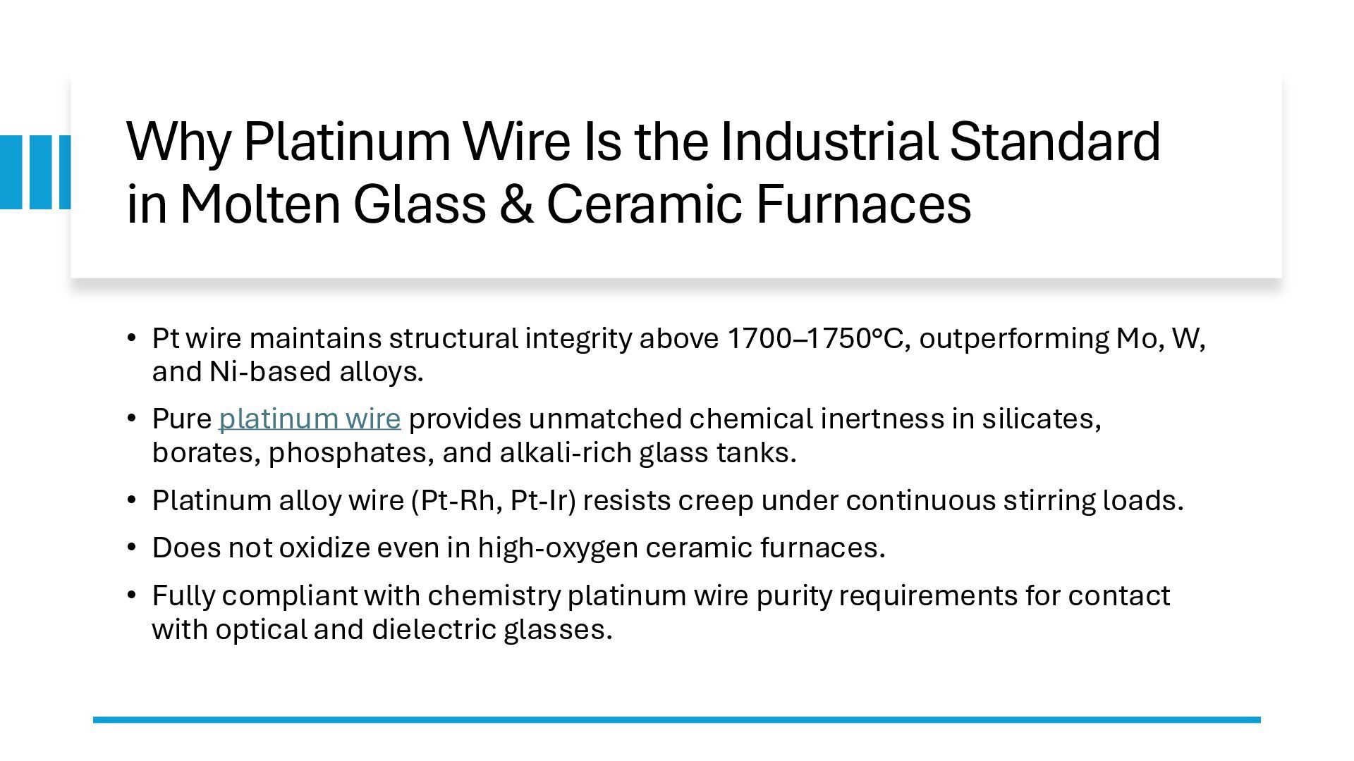Understand the critical role of platinum wire in glass and ceramic processing. This presentation explains its use in high-temperature stirring, crystal seeding, and precise temperature sensing, highlighting purity, oxidation resistance, and reliability in aggressive thermal environments.