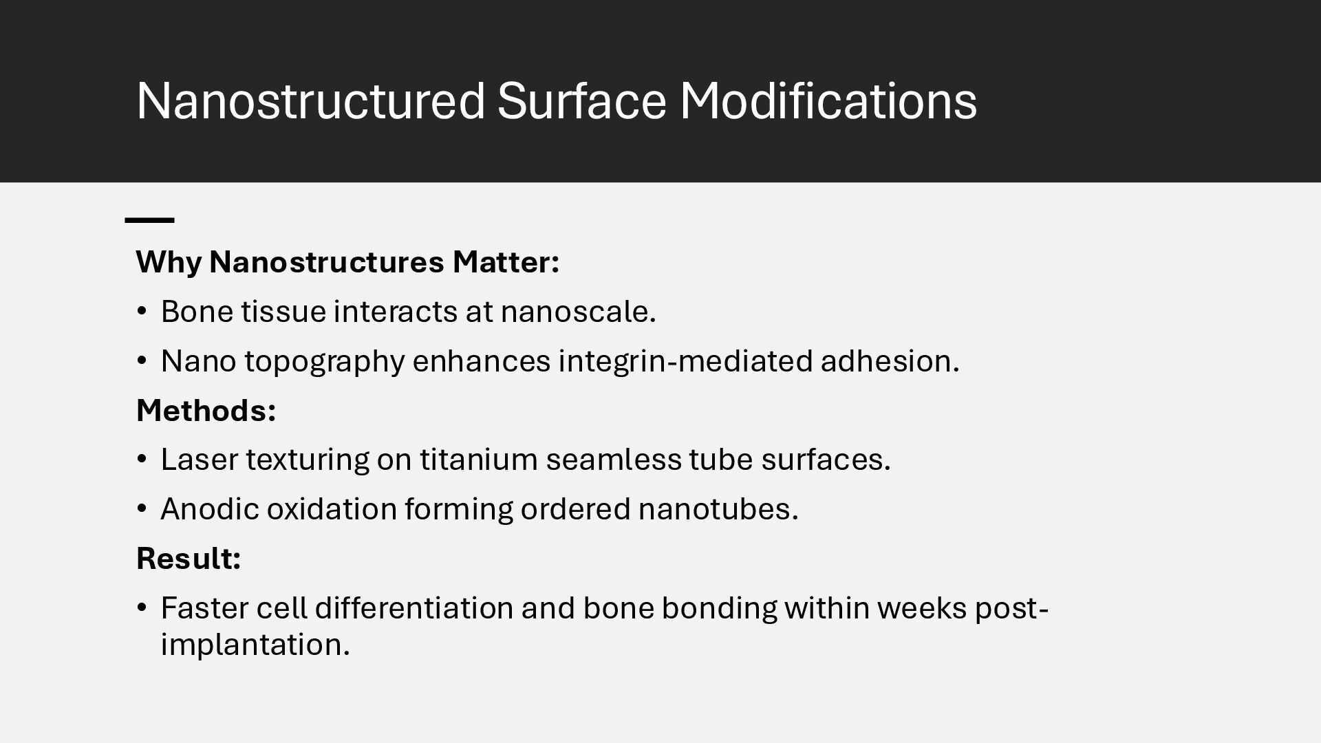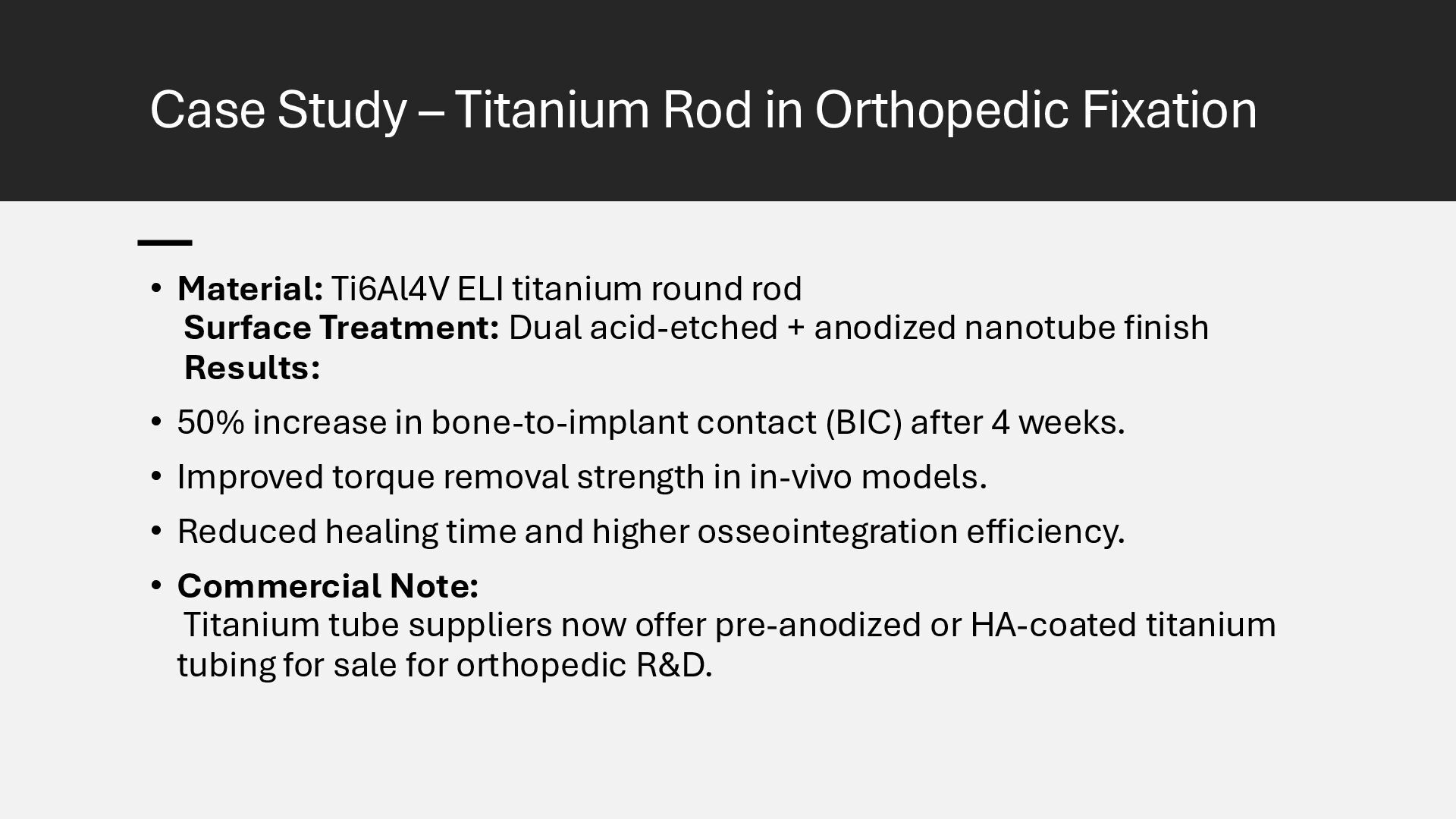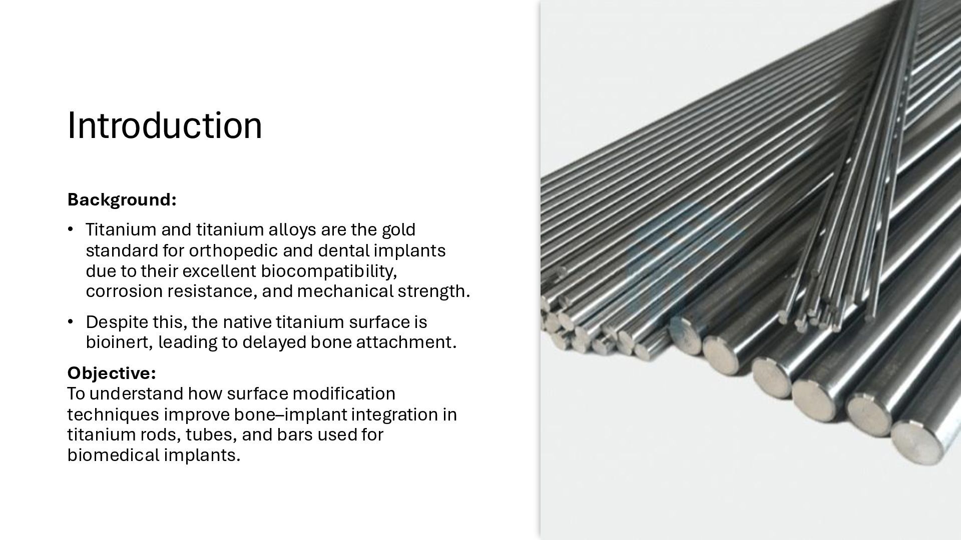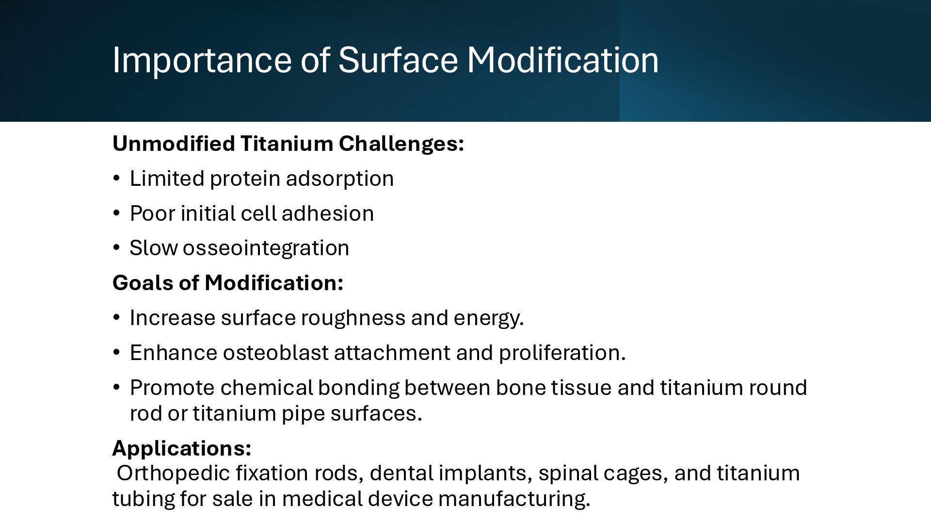 Learn how advanced surface modification techniques on titanium rods improve bone integration in orthopedic implants. This presentation covers micro-texturing, coatings, and bioactive layers that boost osseointegration, stability, and long-term implant performance.