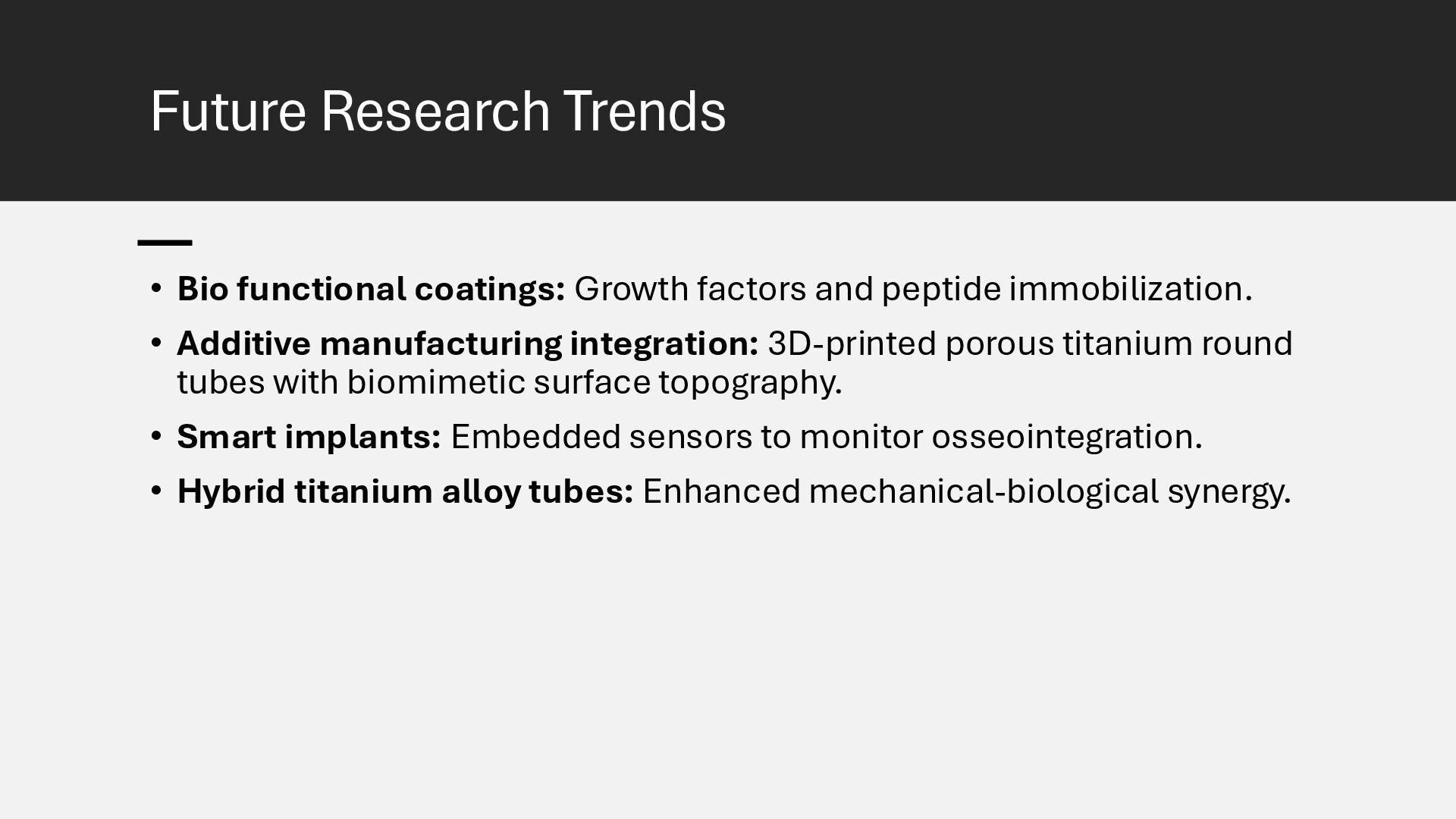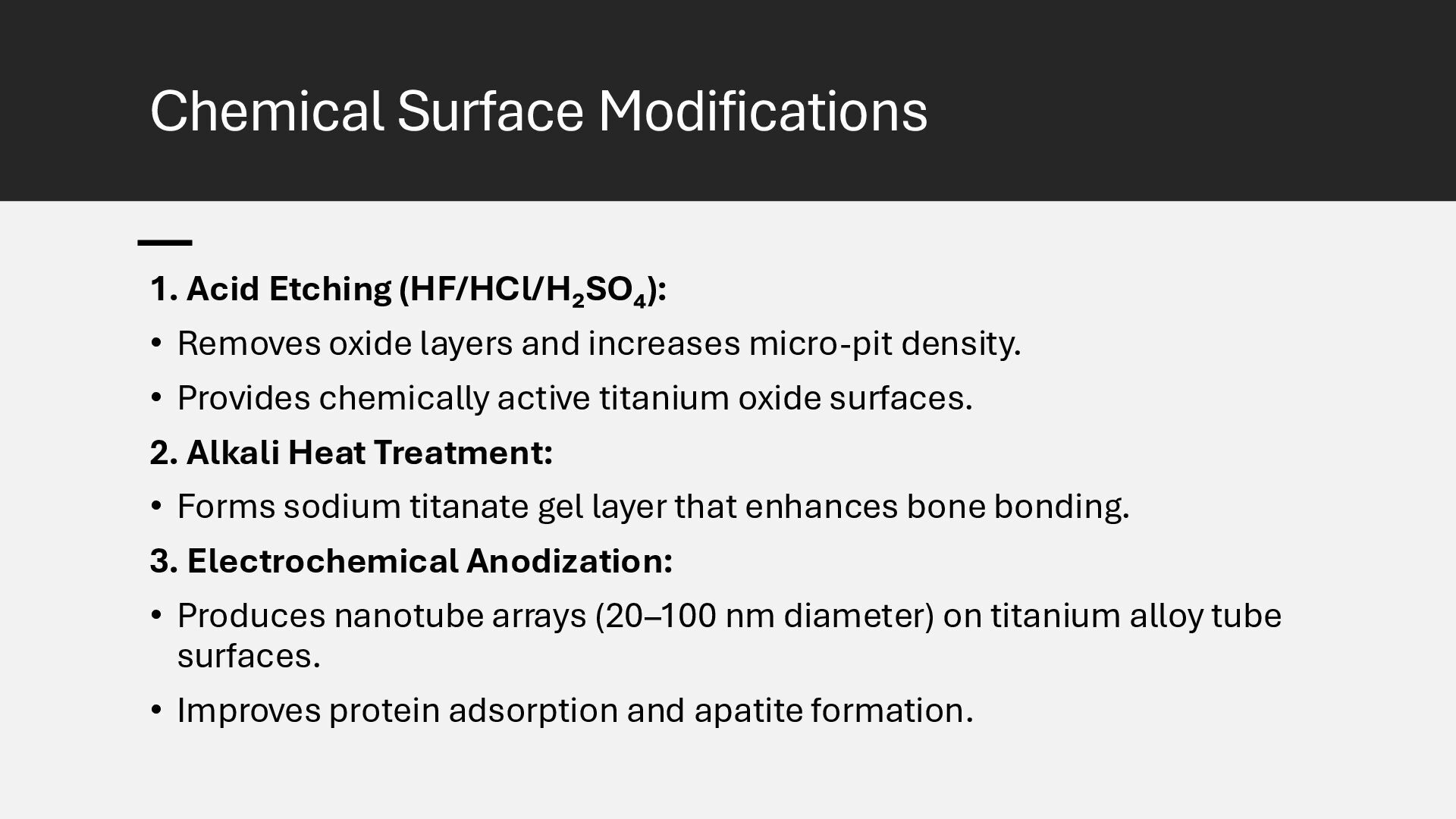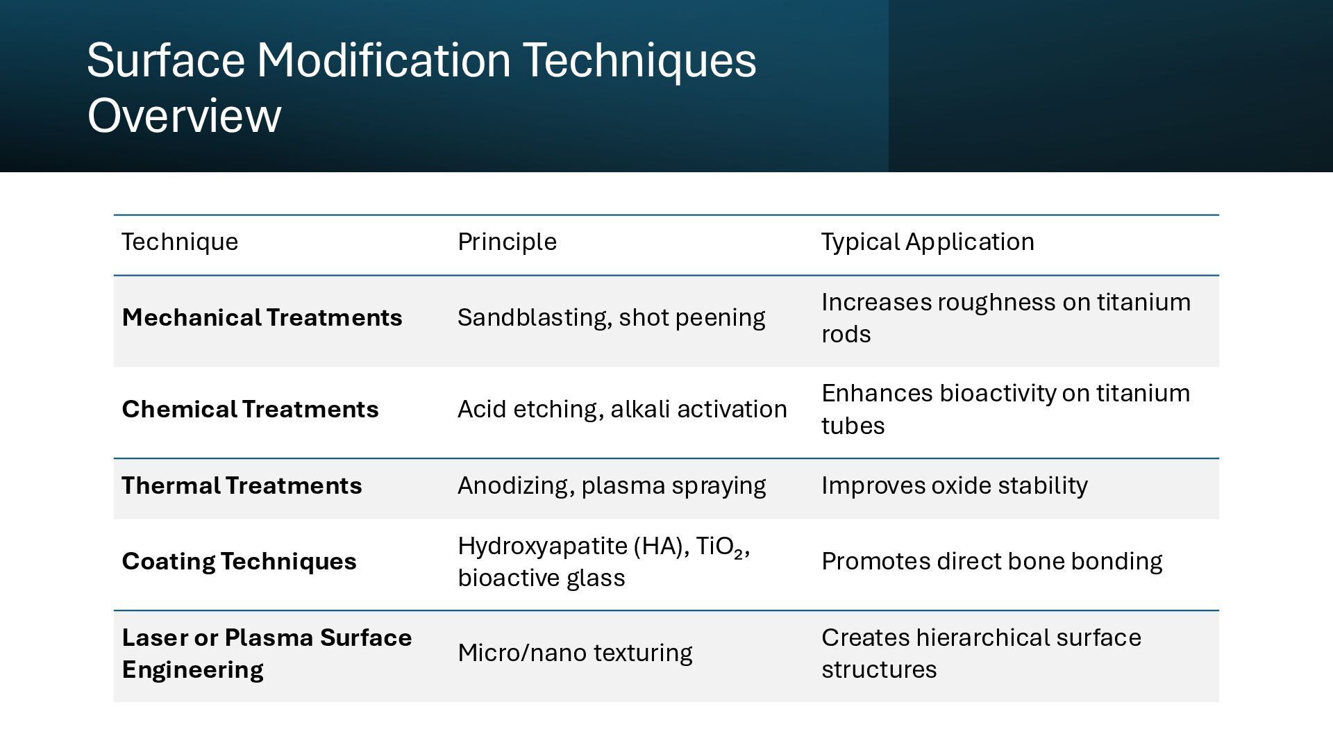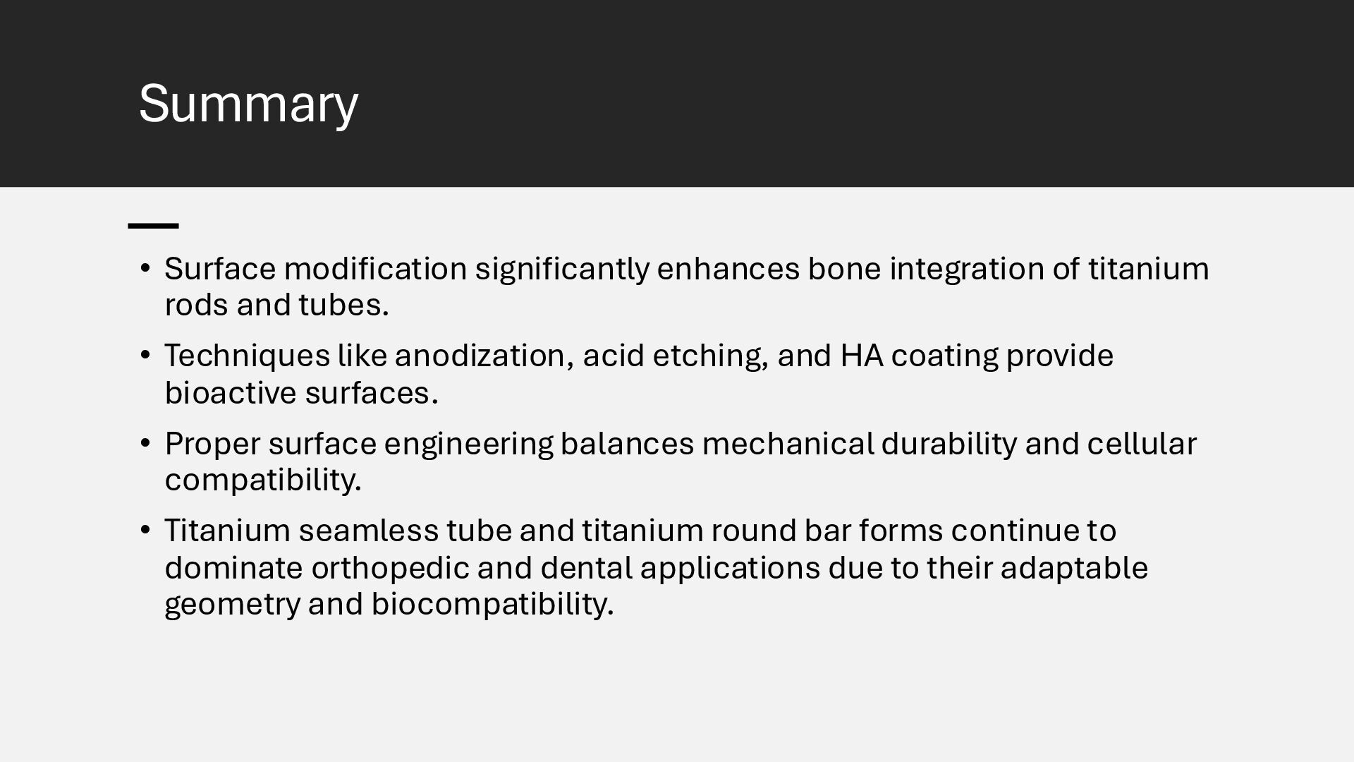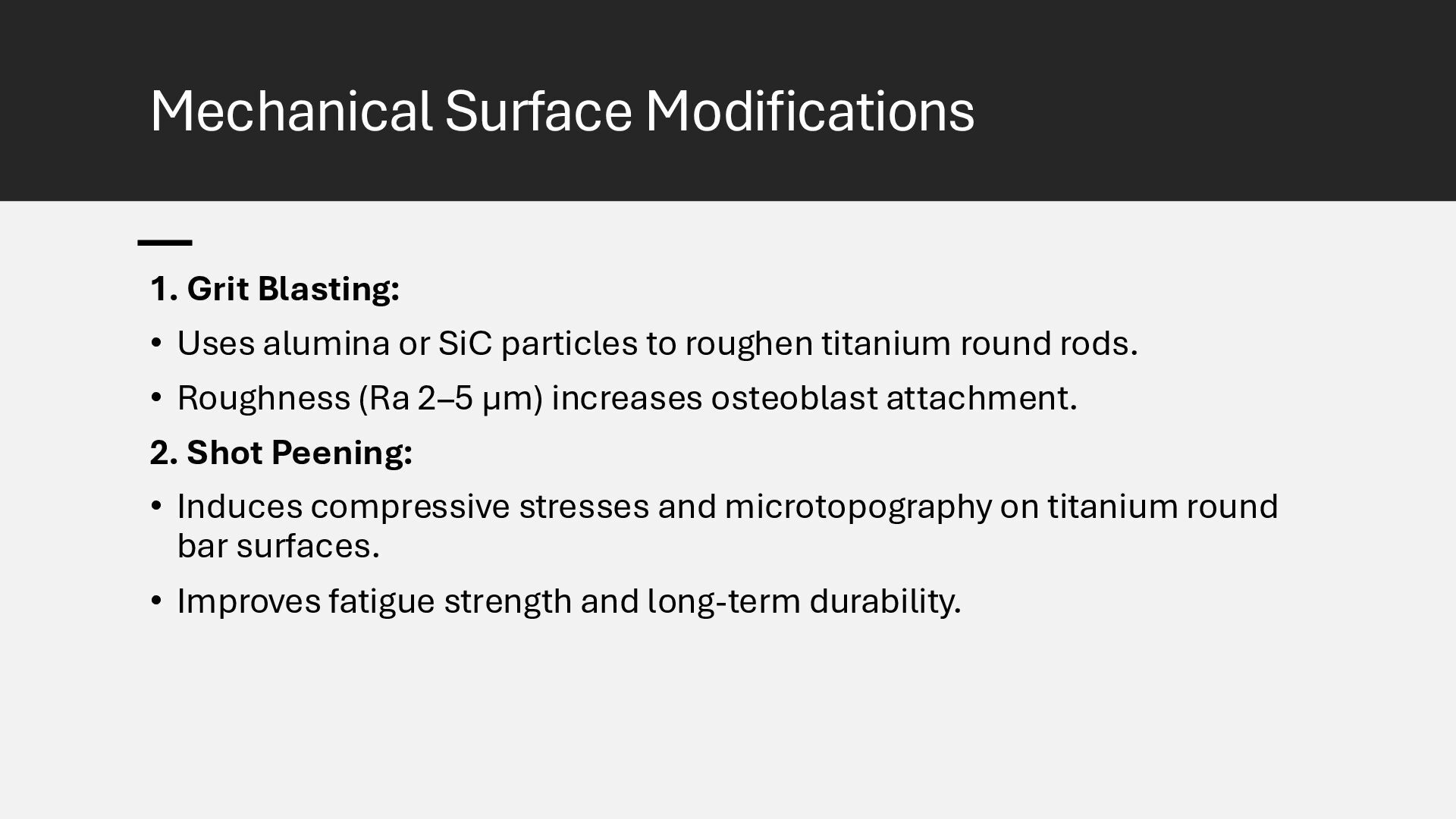 Learn how advanced surface modification techniques on titanium rods improve bone integration in orthopedic implants. This presentation covers micro-texturing, coatings, and bioactive layers that boost osseointegration, stability, and long-term implant performance.