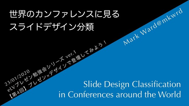 Written in Japanese 23/January/2020 eLV_プレゼン×デザインで登壇してみよう!での発表資料です。 海外カンファレンスのスライドデザインをまとめて分類したものが書いてあります。