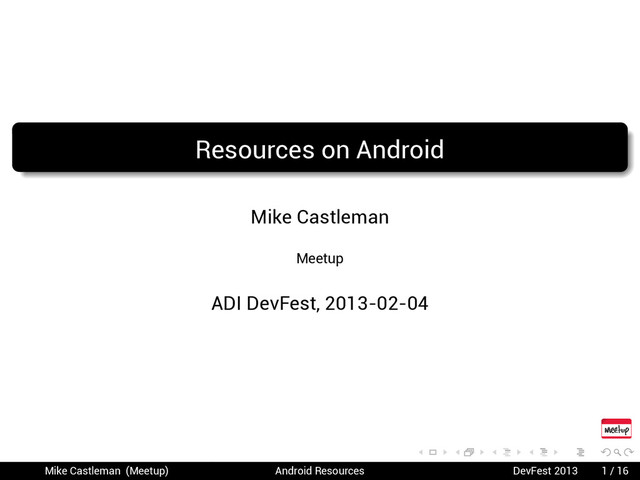 etc. Screen size: small, medium (phones); large, xlarge (tablets) Language (and country): en, es, en-rCA Portrait/landscape: port, land Screen density: ldpi, mdpi, hdpi, xhdpi Many others, see SDK docs if interested. Mike Castleman (Meetup) Android Resources DevFest 2013 5 / 16