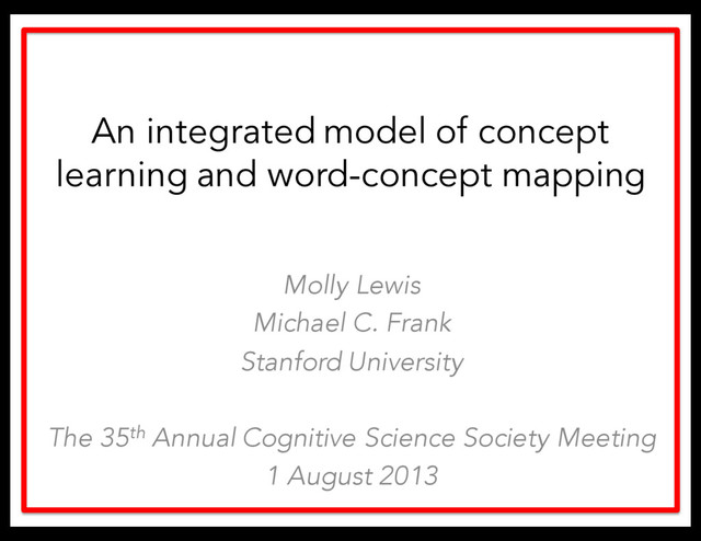Yu, 2008; Yu & Smith, 2007) – Disambiguation (Markman & Wachtel, 1988; Clark, 1987) – Social cues (Baldwin,1991; Baldwin, 1993) The Generalization Problem – Shape bias (Smith, Jones, Landau, Gershkoff-Stowe, & Samuelson, 2002) – Taxonomic bias (Markman, 1990) – Apart from word learning, well-studied in adults (e.g., Laurence & Margolis, 1999; Rosch & Mervis, 1975; Rosch, Mervis, Gray, Johnson, & Boyes-Braem, 1976; Medin & Ortony, 1989; Sloutsky, 2001, for developmental work) Solving the word learning problems