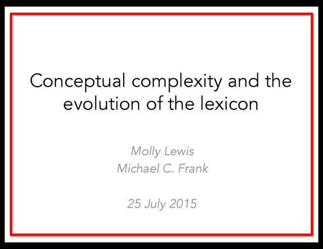 emerges from the interaction of speaker constraints (e.g., memory) and listener constraints (i.e., expressivity). Speaker: memory constraints energetic constraints Listener: expressivity constraint (Zipf, 1949; Regier, Kay, & Kherpertal, 2011; Kirby, et al. 2015)