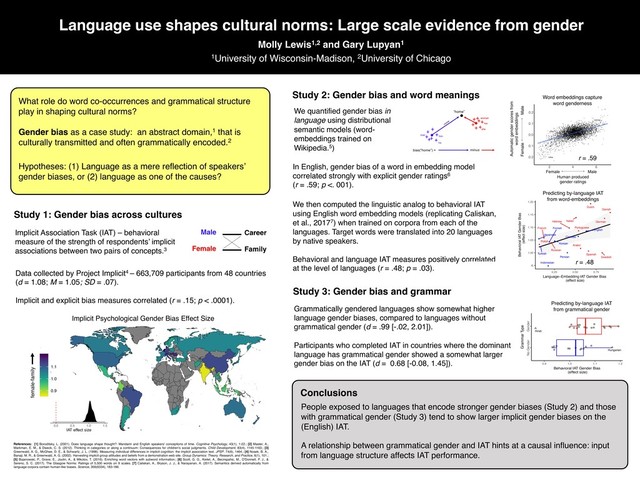 use shapes cultural norms: Large scale evidence from gender Molly Lewis1,2 and Gary Lupyan1 1University of Wisconsin-Madison, 2University of Chicago No Gender Gender 0.9 1.0 1.1 1.2 Behavioral IAT Gender Bias (effect size) Grammar Type Behavioral IAT and Grammar Type Study 1: Gender bias across cultures What role do word co-occurrences and grammatical structure play in shaping cultural norms? Gender bias as a case study: an abstract domain,1 that is culturally transmitted and often grammatically encoded.2 Hypotheses: (1) Language as a mere reflection of speakers’ gender biases, or (2) language as one of the causes? Implicit Association Task (IAT) – behavioral measure of the strength of respondents’ implicit associations between two pairs of concepts.3 Male Female Career Family Data collected by Project Implicit4 – 663,709 participants from 48 countries (d = 1.08; M = 1.05; SD = .07). Implicit and explicit bias measures correlated (r = .15; p < .0001). Study 2: Gender bias and word meanings Study 3: Gender bias and grammar Conclusions Grammatically gendered languages show somewhat higher language gender biases, compared to languages without grammatical gender (d = .99 [-.02, 2.01]). Participants who completed IAT in countries where the dominant language has grammatical gender showed a somewhat larger gender bias on the IAT (d = 0.68 [-0.08, 1.45]). People exposed to languages that encode stronger gender biases (Study 2) and those with grammatical gender (Study 3) tend to show larger implicit gender biases on the (English) IAT. A relationship between grammatical gender and IAT hints at a causal influence: input from language structure affects IAT performance. 0.9 1.0 1.1 Implicit psychological gender bias effect size female-family Imp r = .59 −0.2 −0.1 0.0 0.1 0.2 2 4 6 Explicit gender norm rating (maleness) Word embedding gender score (maleness) Explicit vs. Language−Embedding word gender bias Imp Impl r = .59 References: [1] Boroditsky, L. (2001). Does language shape thought?: Mandarin and English speakers' conceptions of time. Cognitive Psychology, 43(1), 1-22.; [2] Master, A., Markman, E. M., & Dweck, C. S. (2012). Thinking in categories or along a continuum: Consequences for children’s social judgments. Child Development, 83(4), 1145-1163.; [3] Greenwald, A. G., McGhee, D. E., & Schwartz, J. L. (1998). Measuring individual differences in implicit cognition: the implicit association test. JPSP, 74(6), 1464.; [4] Nosek, B. A., Banaji, M. R., & Greenwald, A. G. (2002). Harvesting implicit group attitudes and beliefs from a demonstration web site. Group Dynamics: Theory, Research, and Practice, 6(1), 101.; [5] Bojanowski, P., Grave, E., Joulin, A., & Mikolov, T. (2016). Enriching word vectors with subword information.; [6] Scott, G. G., Keitel, A., Becirspahic, M., O’Donnell, P. J., & Sereno, S. C. (2017). The Glasgow Norms: Ratings of 5,500 words on 9 scales. [7] Caliskan, A., Bryson, J. J., & Narayanan, A. (2017). Semantics derived automatically from language corpora contain human-like biases. Science, 356(6334), 183-186. 0.9 1.0 1.1 Implicit psychological gender bias effect size Implicit Psychological Gender Bias Effect Size Hindi Hungarian In English, gender bias of a word in embedding model correlated strongly with explicit gender ratings6 (r = .59; p <. 001). We then computed the linguistic analog to behavioral IAT using English word embedding models (replicating Caliskan, et al., 20177) when trained on corpora from each of the languages. Target words were translated into 20 languages by native speakers. Behavioral and language IAT measures positively correlated at the level of languages (r = .48; p = .03). We quantified gender bias in language using distributional semantic models (word- embeddings trained on Wikipedia.5) Arabic Danish German English Spanish Persian Finnish French Hebrew Indonesian Italian Japanese Korean Dutch Polish Portuguese Russian Swedish Turkish Chinese 0.95 1.00 1.05 1.10 1.15 1.20 0.25 0.50 0.75 Language−Embedding IAT Gender Bias (effect size) Behavioral IAT Gender Bias (effect size) Behavioral and Language−Embedding IAT r = .48 Male Female Automatic gender scores from word embeddings Male Female Human produced gender ratings Word embeddings capture word genderness Predicting by-language IAT from word-embeddings Predicting by-language IAT from grammatical gender nurse butcher clean