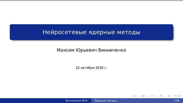 . . . . . . . . . . . . . . . . . . . . . . . . . . . . . . Аналитическое вычисление NNGP ядра Двухслойная сеть f, с весами W и линейным классификатором θ: f(x, θ, W) = θTWx √ n Обучаем последний слой методом kernel regression: k(x, y) = lim n→∞ ⟨ 1 √ n Wnx, 1 √ n Wny ⟩ = ⟨x, y⟩ Доказательство: lim n→∞ ⟨ 1 √ n Wnx, 1 √ n Wny ⟩ = lim n→∞ 1 n ∑n i=1 ⟨x, wi⟩⟨y, wi⟩ = Ew ⟨x, w⟩ · ⟨y, w⟩ = E ∑ ij wi xi · wj yj = E ∑ i w2 i xi yj = ∑ i xi · yi = ⟨x, y⟩ Винниченко М.Ю. Ядерные методы 8/29