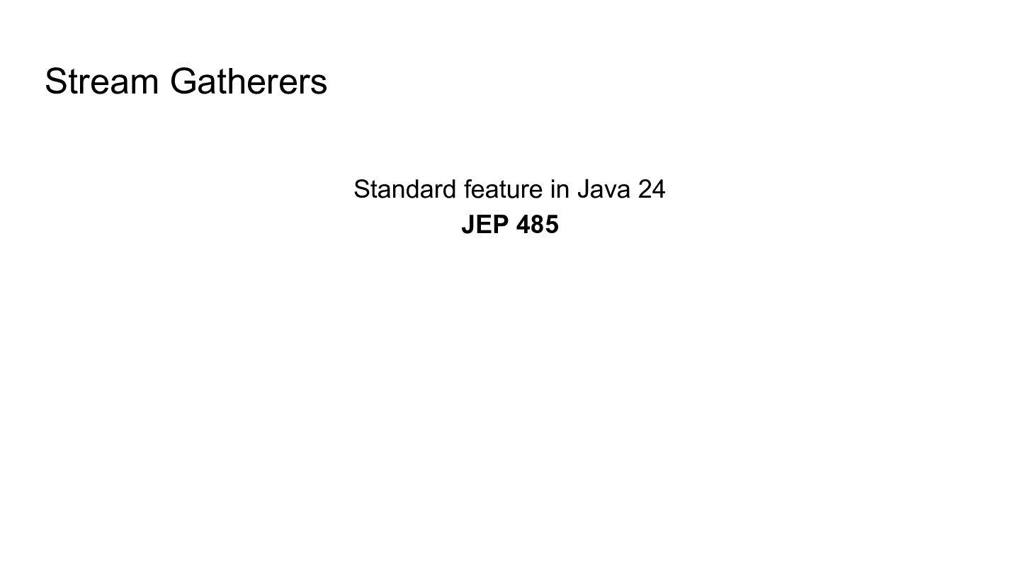 Stream Gatherers - Deep Dive with the Expert: https://youtu.be/v_5SKpfkI2U Gatherers: The API Your Stream Was Missing: https://youtu.be/oVdWfU_IObY Hunting with Stream Gatherers: https://youtu.be/rvW8tu1n5x4 Extending Functional Pipelines with Gatherers: https://www.youtube.com/live/dxVDiJsyu3Y ▶