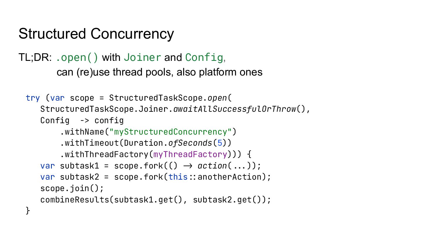 also platform ones Structured Concurrency try (var scope = StructuredTaskScope.open( StructuredTaskScope.Joiner.awaitAllSuccessfulOrThrow(), Config -> config .withName("myStructuredConcurrency") .withTimeout(Duration.ofSeconds(5)) .withThreadFactory(myThreadFactory))) { var subtask1 = scope.fork(() -> action(--.)); var subtask2 = scope.fork(this-:anotherAction); scope.join(); combineResults(subtask1.get(), subtask2.get()); }