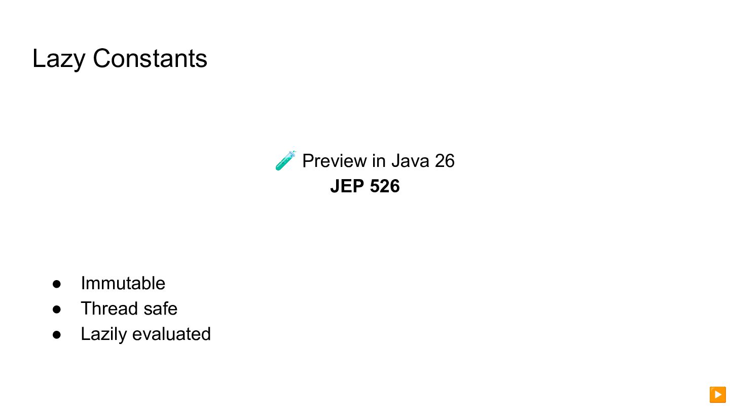 13. Lazy Constants 🧪 Preview in Java 26 JEP 526 •