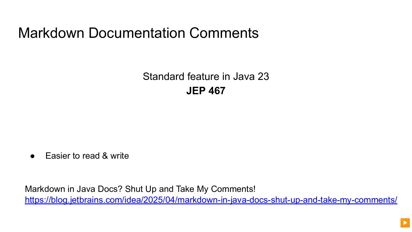 • Easier to read & write Markdown in Java Docs? Shut Up and Take My Comments! https://blog.jetbrains.com/idea/2025/04/markdown-in-java-docs-shut-up-and-take-my-comments/ ▶