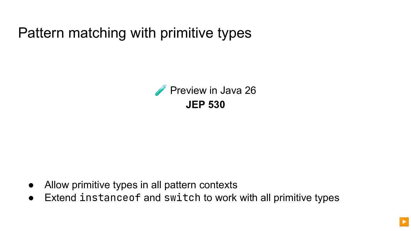 JEP 530 • Allow primitive types in all pattern contexts • Extend instanceof and switch to work with all primitive types ▶