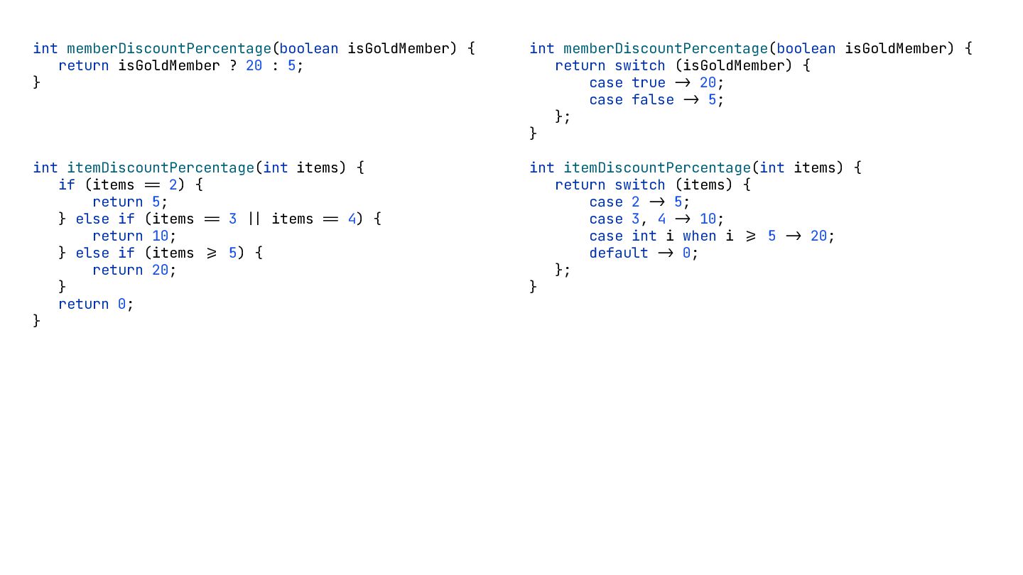 } int itemDiscountPercentage(int items) { if (items -= 2) { return 5; } else if (items -= 3 -| items -= 4) { return 10; } else if (items -= 5) { return 20; } return 0; } int memberDiscountPercentage(boolean isGoldMember) { return switch (isGoldMember) { case true -> 20; case false -> 5; }; } int itemDiscountPercentage(int items) { return switch (items) { case 2 -> 5; case 3, 4 -> 10; case int i when i -= 5 -> 20; default -> 0; }; }