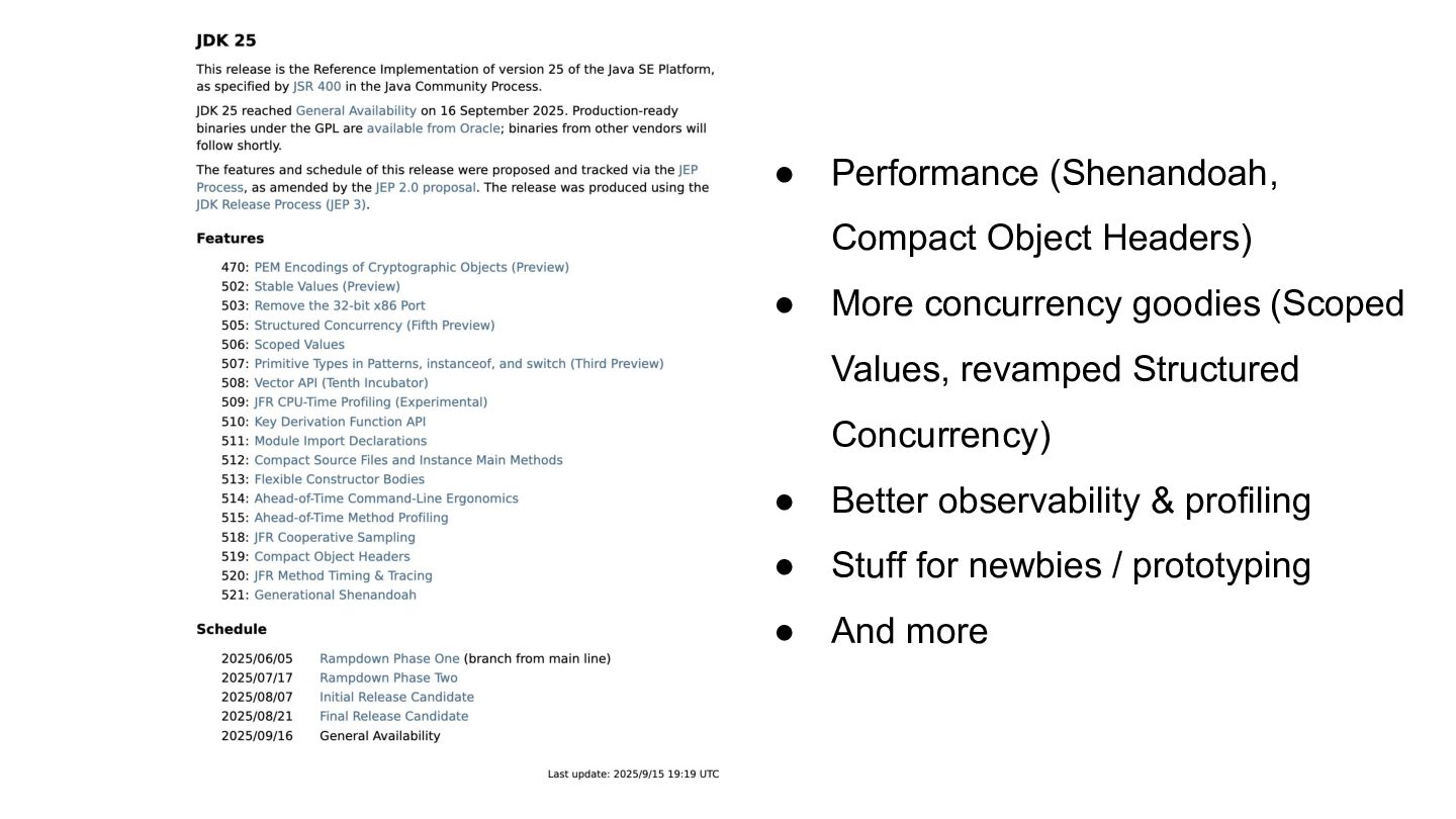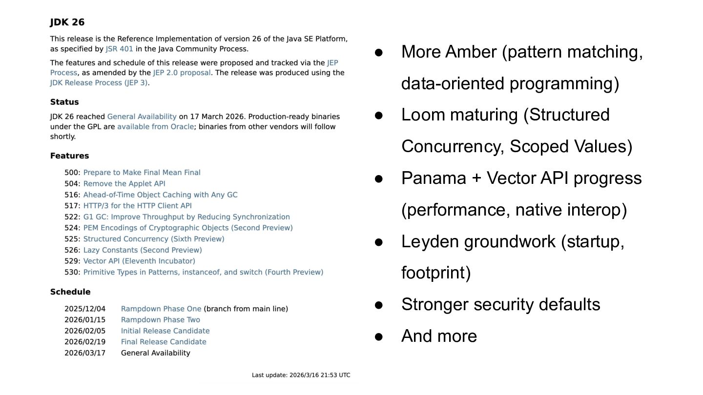 (Structured Concurrency, Scoped Values) • Panama + Vector API progress (performance, native interop) • Leyden groundwork (startup, footprint) • Stronger security defaults • And more