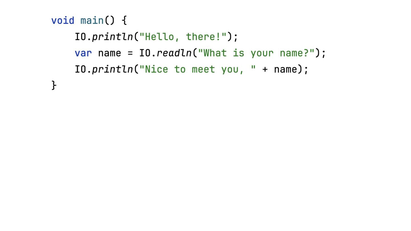 { public static void main(String[] args) { System.out.println("Hello World!"); } } void main() { IO.println("Hello World!"); }