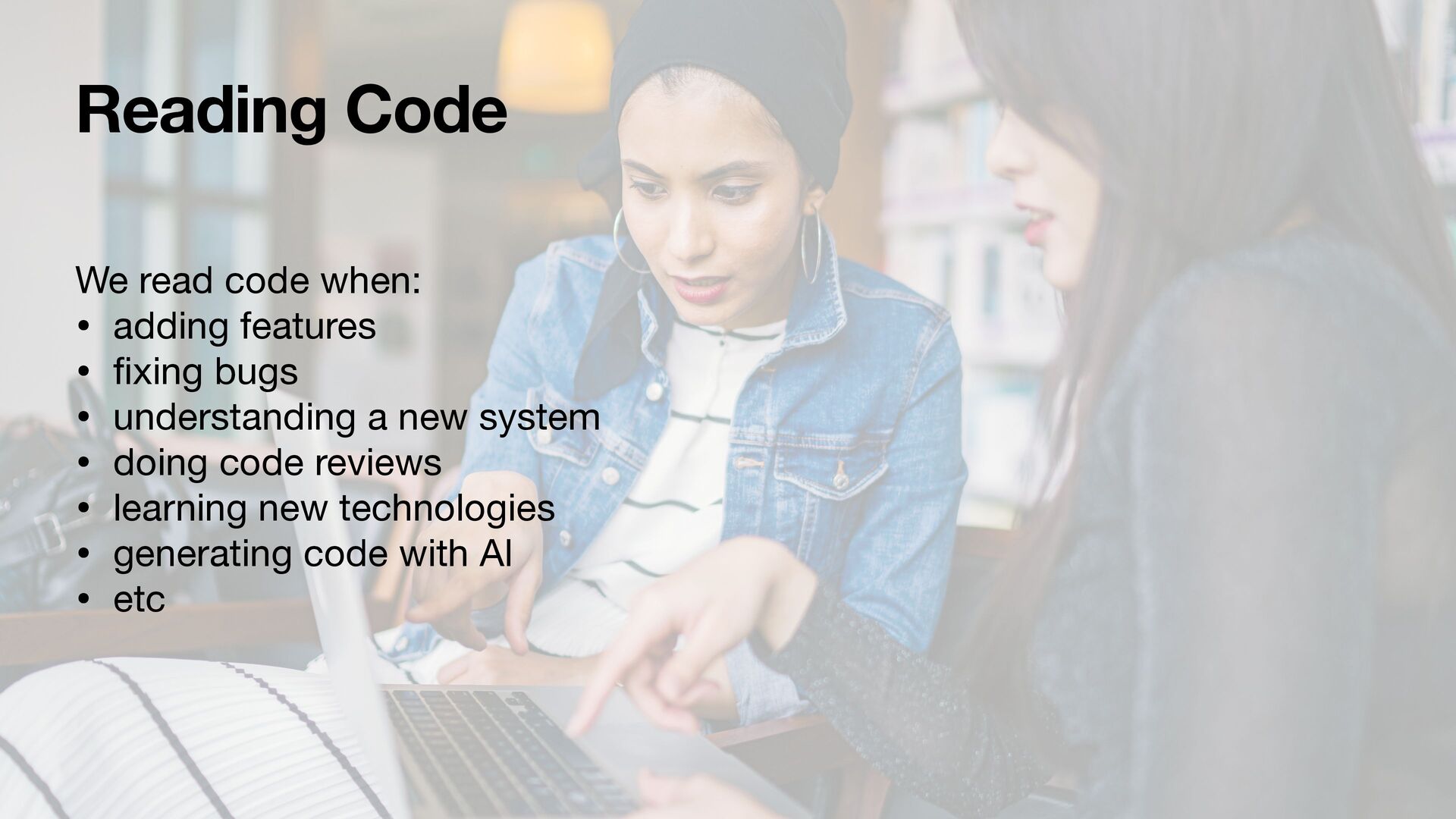 As developers, we spend a lot of time learning to write code, while spending little to no time learning to read code. Meanwhile, we often spend more time reading code than actually writing it. Shouldn’t we be spending at least the same amount of time and effort improving this skill? Deliberate practice can help us get better at reading code. Learning how to better read and understand code, can in turn teach us what makes code readable. This might even help us to write code that is easier to read.