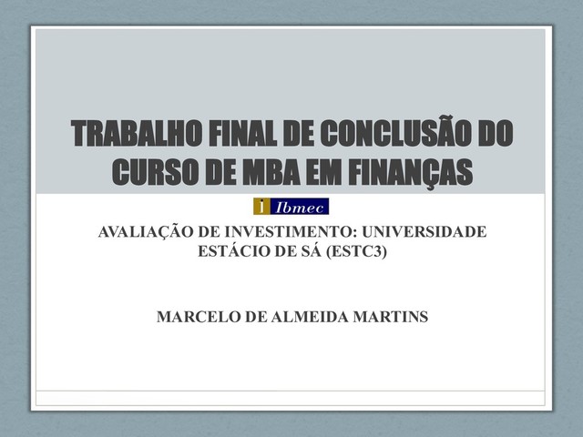 Presentation - This paper addresses Discounted Cash Flow based Valuation of Universidade Estácio de Sá (ESTC3), that prices an asset or organisation today based on its expected return in the future.