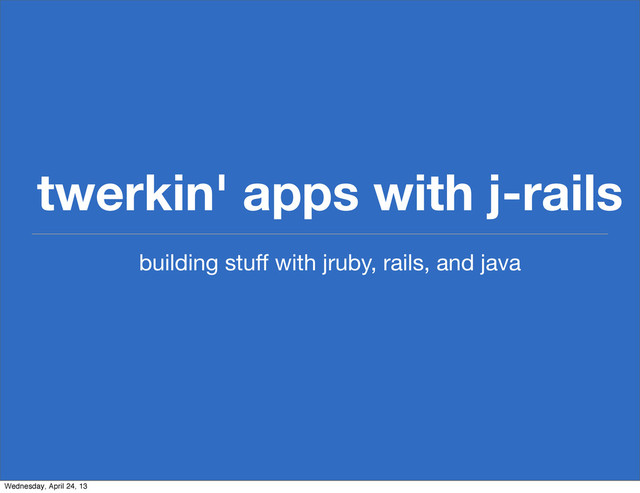at org/jruby/javasupport/JavaUtilities.java:54 method_missing at file:.../ jruby-1.7.3/lib/jruby.jar!/jruby/java/ java_package_module_template.rb:14 load at org/jruby/ RubyKernel.java:1046 Wednesday, April 24, 13