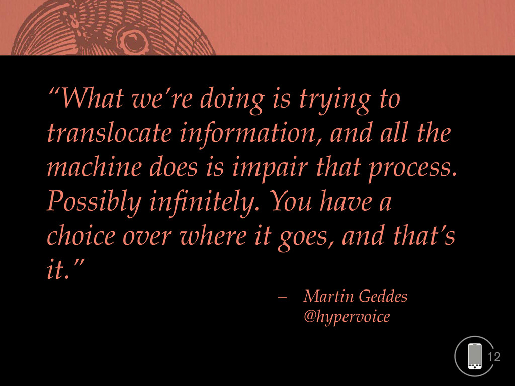 all the machine does is impair that process. Possibly infinitely. You have a choice over where it goes, and that’s it.”! ! ! ! ! ! ! ! ! !– !Martin Geddes! ! ! ! ! ! ! ! ! ! !@hypervoice!