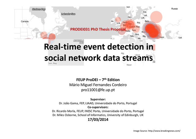 Today online social network services are challenging state-of-the-art social media mining algorithms due to its real-time nature, scale and amount of unstructured data generated. Given the amount and cadence of the data made available by online social network services like Twitter, classical text mining techniques are not suitable to deal with such new mining challenges. Event detection is no exception, state-of-the-art algorithms rely on text mining techniques applied to pre-known datasets processed with no restrictions about computational complexity and required execution time per document analysis. If from the point of view of a natural language processing, text mining and unsupervised learning, the problem of detecting events in unbounded text streams is hard, dealing with dynamic networks with millions of nodes and edges is also not an easy task.