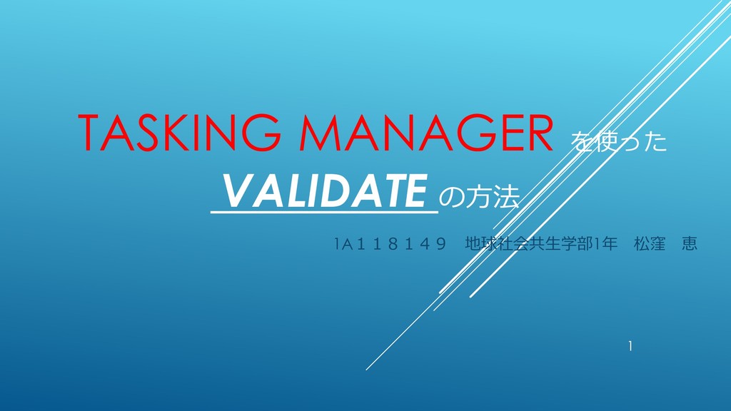 TASKING MANAGER を使った VALIDATE の方法 1A118149 地球社会共生学部1年 松窪 恵 1