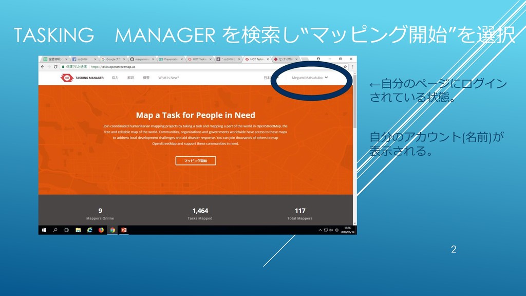TASKING MANAGER を検索し‶マッピング開始”を選択 ←自分のページにログイン されている状態。 自分のアカウント(名前)が 表示される。 2