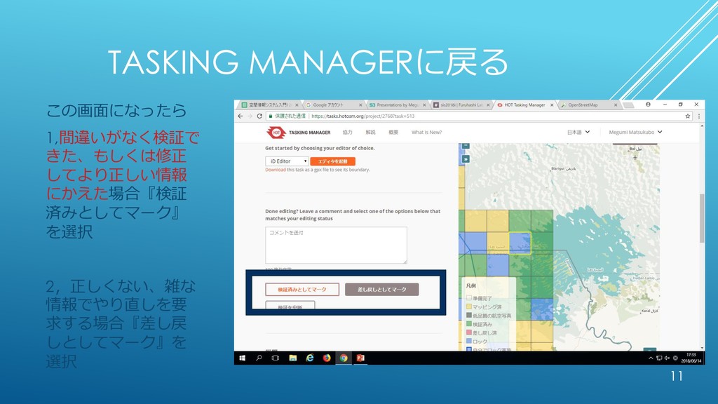 TASKING MANAGERに戻る この画面になったら 1,間違いがなく検証で きた、もしくは修正 してより正しい情報 にかえた場合『検証 済みとしてマーク』 を選択 2,正しくない、雑な